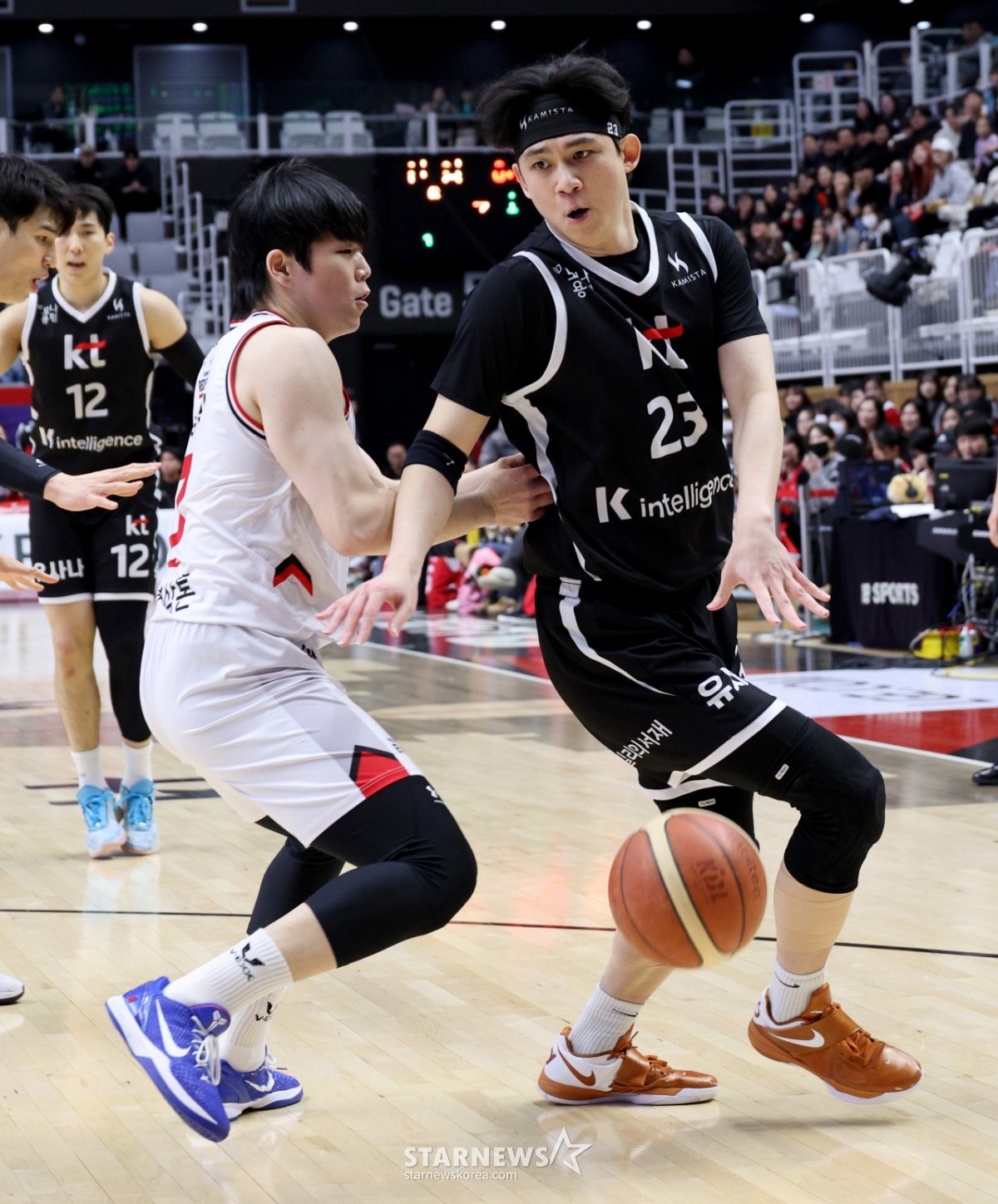 KT 박준영이 21일 수원kt소닉붐아레나에서 열린 2025-2026 프로농구 KT와 정관장 경기에서 표승빈을 따돌리며 돌파를 시도하고 있다..202601.21.