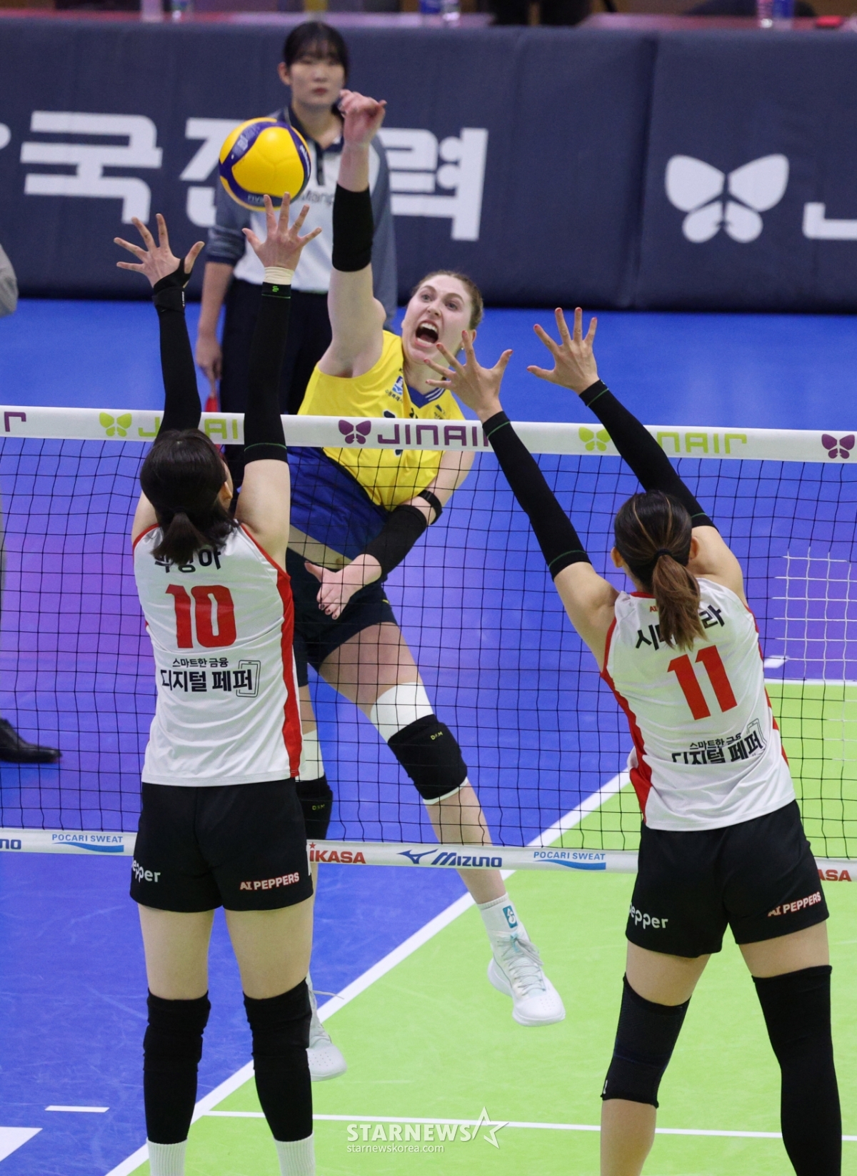 스포츠일반[포토] 카리 '틀어치기 또 성공'발행 : 2026.01.21 ・ 20:02수원=김진경 대기자2025-2026 V-리그 여자부 현대건설 대 페퍼저축은행 경기가 21일 경기도 수원체육관에서 열렸다.현대건설 카리가 페퍼저축은행 박정아, 시마무라의 블로킹 위로 강스파이크를 날리고 있다.<저작권자 © 스타뉴스, 무단전재 및 재배포 금지>배구V리그현대건설페퍼저축은행양효진블로퀸추천 기사김진경 대기자기자홈좋아요 스포츠-일반의 인기 급상승 뉴스스포츠-일반의 최신 뉴스
