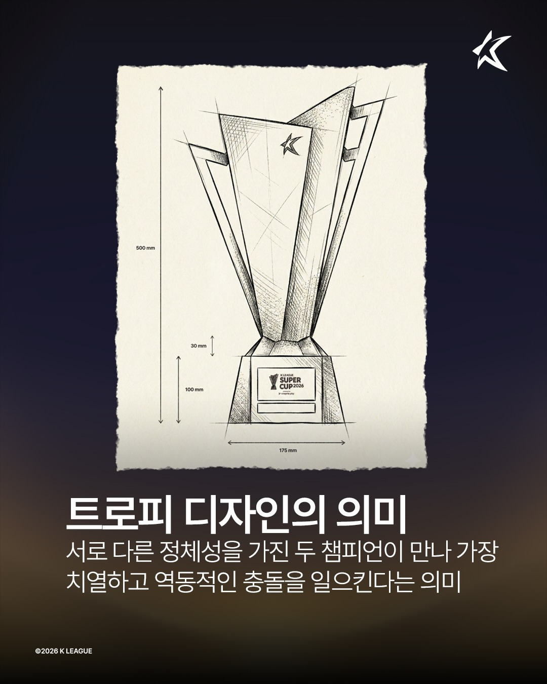 22일 공식 채널을 통해 트로피 디자인을 공개한 연맹은 "서로 다른 정체성을 가진 두 챔피언이 만나 가장 치열하고 역동적인 충돌을 일으킨다는 의미"라고 설명했다.