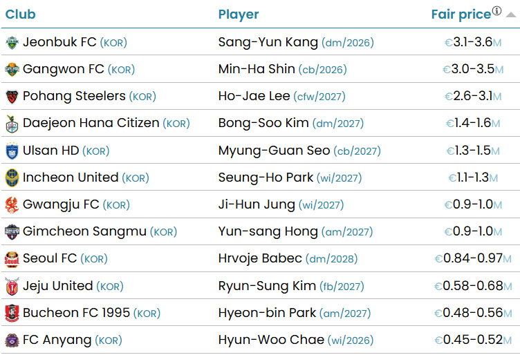 또 포항 스틸러스에서는 이호재(26)가 최대 310만 유로(약 54억원), 대전하나시티즌에서는 김봉수(27)가 160만 유로(약 28억원), 울산 HD에서는 서명관(24)이 150만 유로(약 26억원)로 각각 구단별 1위에 올랐다.