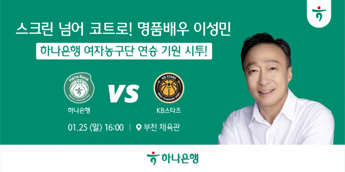 하나은행은 23일 보도자료를 통해 오는 25일 오후 4시 부천체육관에서 열리는 청주 KB스타즈와 홈경기에 배우 이성민을 초청해 승리 기원 시투를 진행한다고 밝혔다.