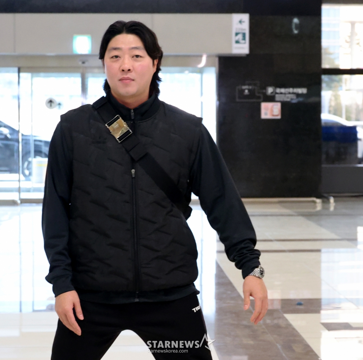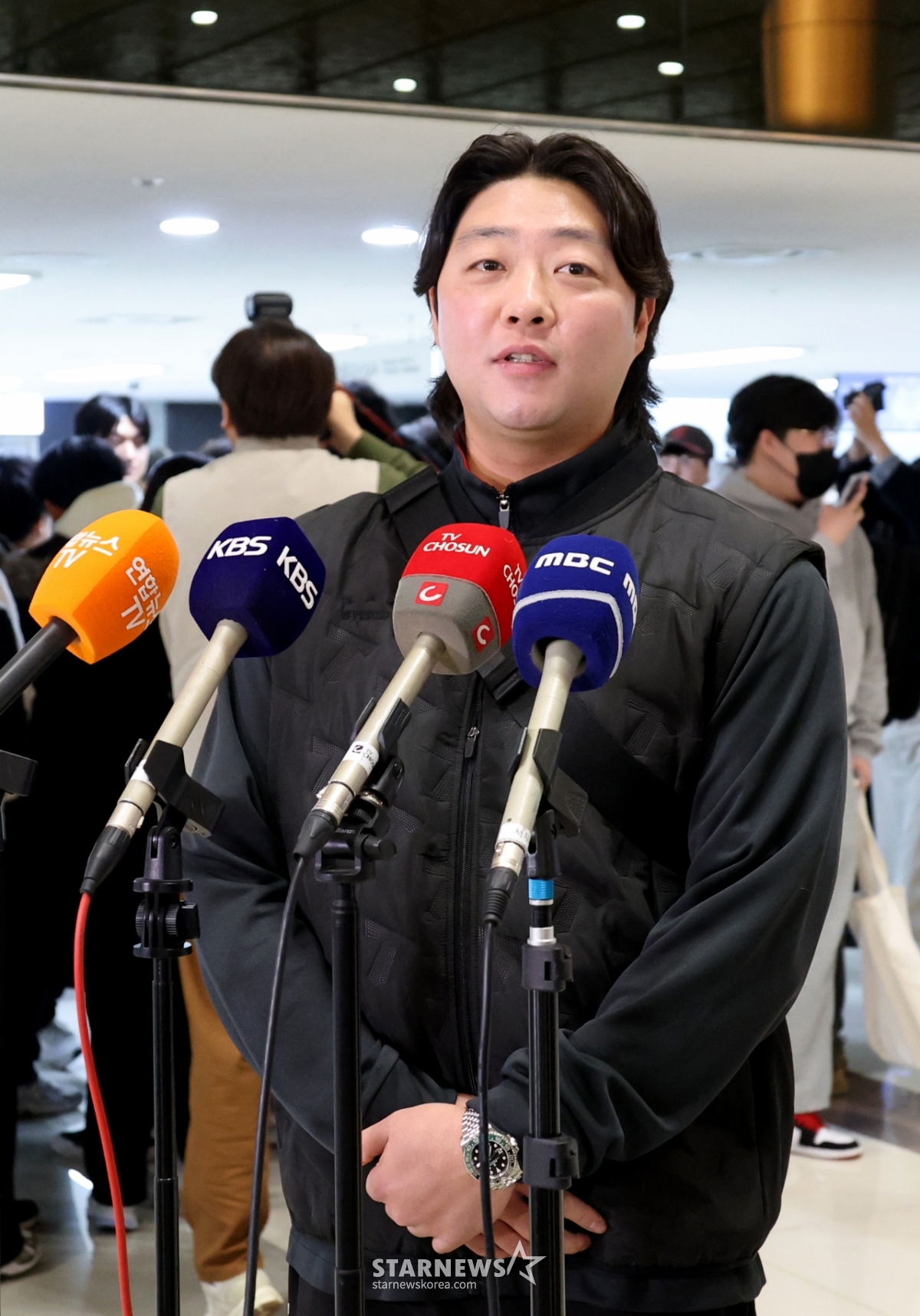 한화에서 기아로 FA 이적한 김범수가 23일 김포공항을 통해 일본으로 출국하고 있다. 출국전 기자회견과 포토타임을 갖는김범수. 202601.23.