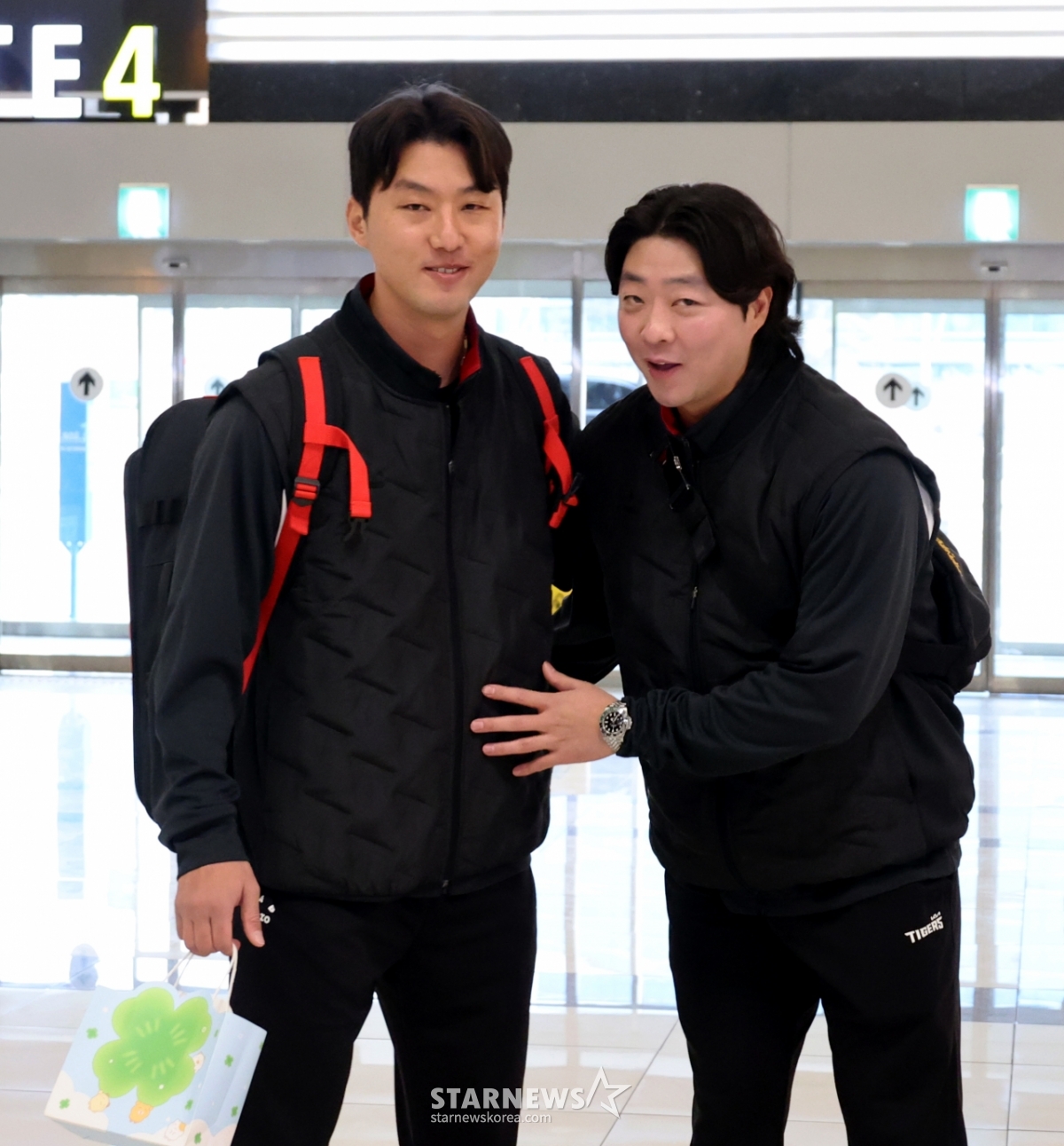 친정으로 돌아온 홍건희와 한화에서 기아로 FA 이적한 김범수가 23일 김포공항을 통해 일본으로 출국하고 있다. 출국전 기자회견과 포토타임을 갖는 홍건희. 202601.23.