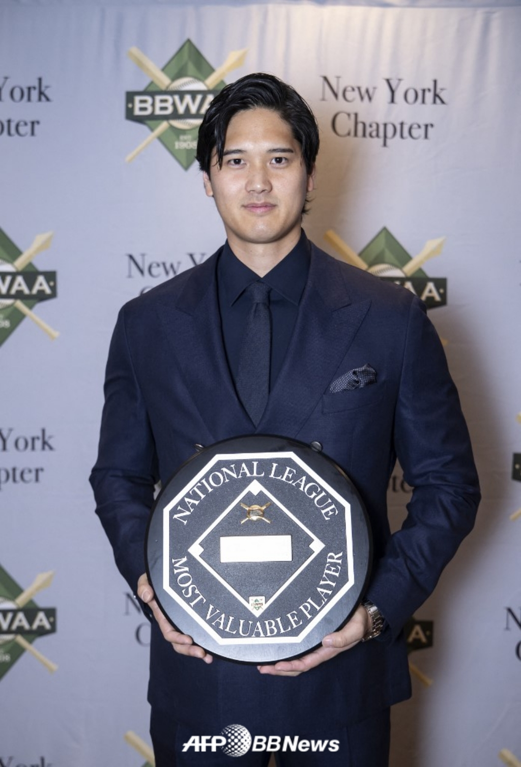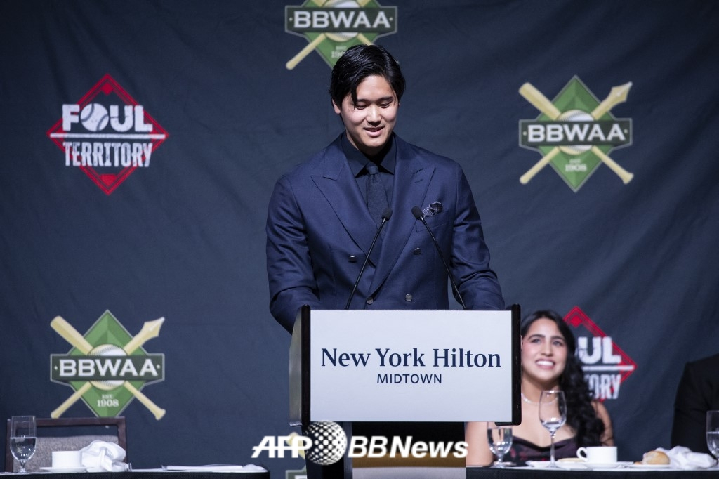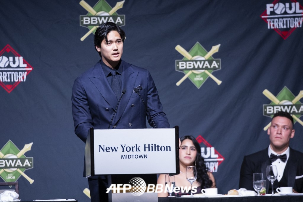 오타니는 지난 25일(한국 시각) 미국 뉴욕에서 열린 전미야구기자협회(BBWAA) 뉴욕 지부가 주최하는 시상식 저녁 만찬에 참석했다.