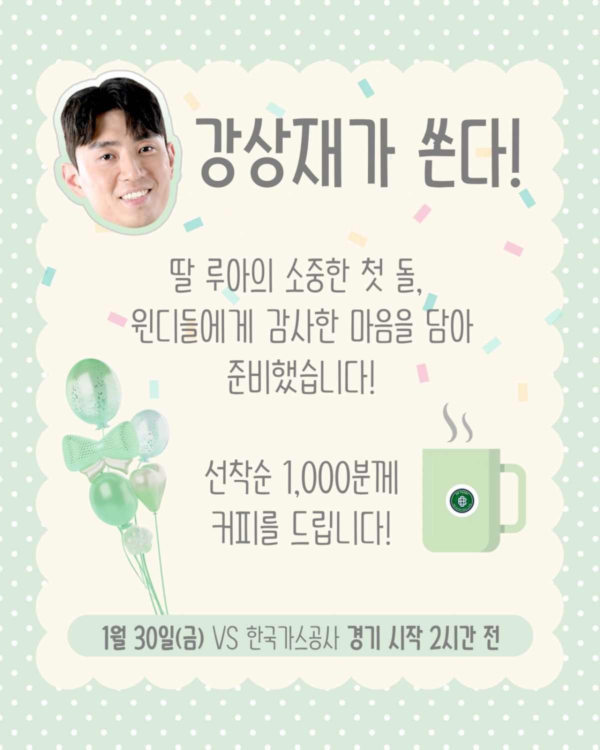 '둘째 딸 돌기념 역조공' 강상재, 팬들에게 커피 1000잔 쏜다