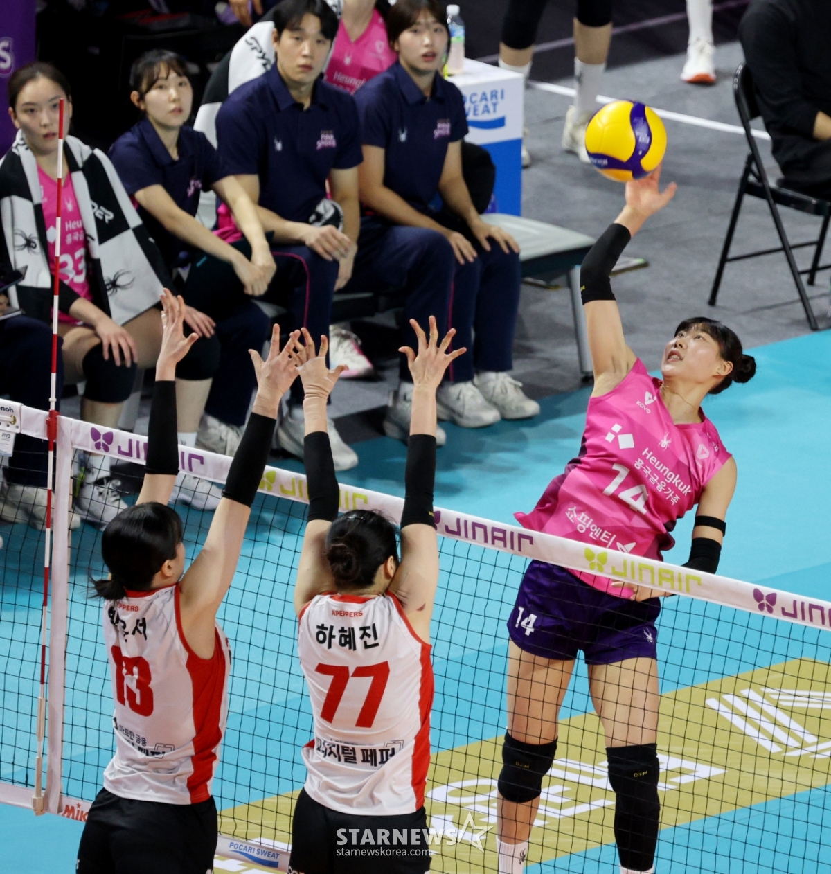 흥국 정윤주가 1일 삼산월드체육관에서 열린 2025-2026 진에서 V리그 흥국생명과 페퍼저축은행경기에서 흥국 이중블로킹에 강타를 시도하고 있다. 2026.02.01.