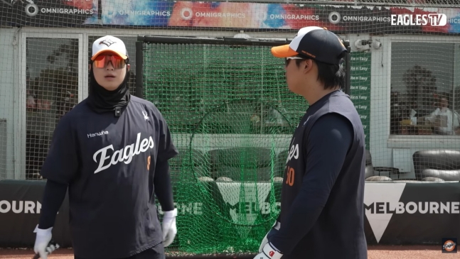 다음 배팅 훈련에 나선 노시환은 어딘가 마음에 들지 않는 부분이 있는 듯 불만족스러워하더니 이내 강백호에게 다가가 팔짱을 끼며 한 번만 이야기를 들어달라고 했다. 이어 한참 동안 생각을 공유하기도 했다.