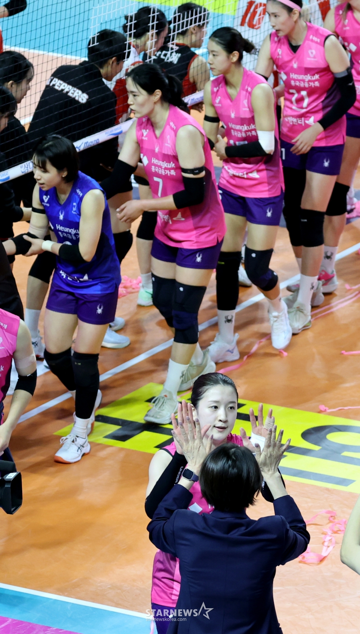 흥국생명 최은지, 레바카 등 선수들이 2일 삼산월드체육관에서 열린 2025-2026 진에서 V리그 흥국생명과 페퍼저축은행경기에서 세트스코어 3-1로 승리한 후 자축하고 있다.