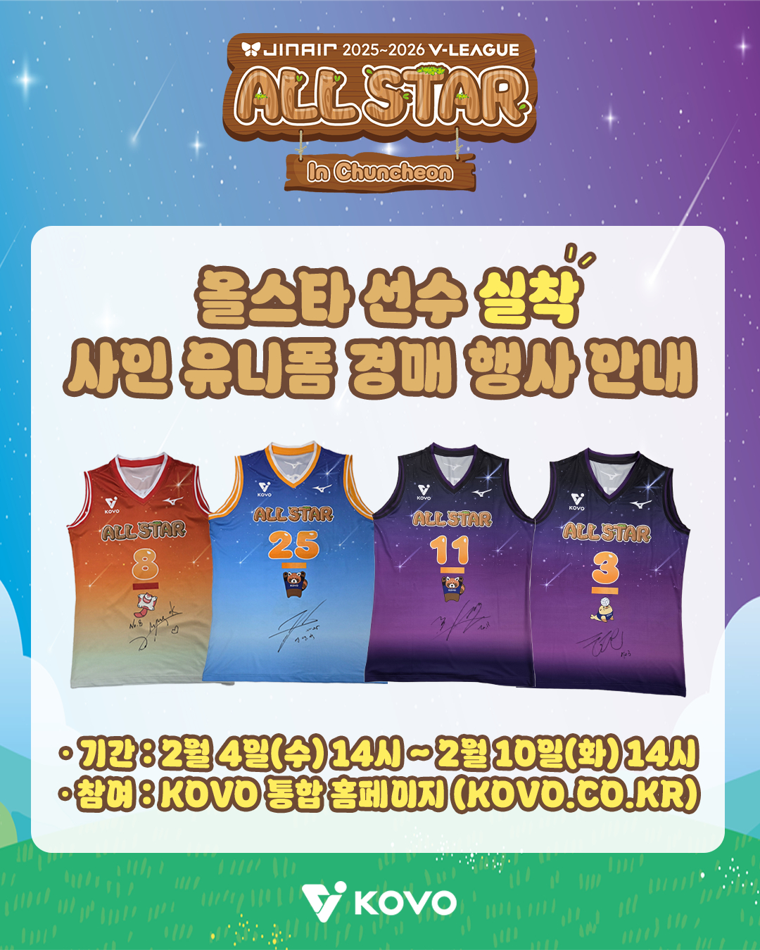 한국배구연맹이 지난 1월 25일 춘천 호반체육관에서 성료한 진에어 2025~2026 V-리그 올스타전에 참가한 올스타 선수들의 실착&친필 사인 유니폼 총 38벌(올스타 미출전 허수봉, 알리 제외)을 4일 오후 2시부터 10시까지 6일간 경매를 진행한다고 밝혔다.