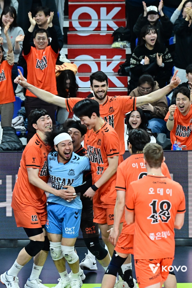 부산 강서체육관에서 벌어진 남자 프로배구 경기에선 부산 OK저축은행이 의정부 KB손해보험을 세트스코어 3-1(21-25, 32-30, 25-21, 28-26)로 제압했다.