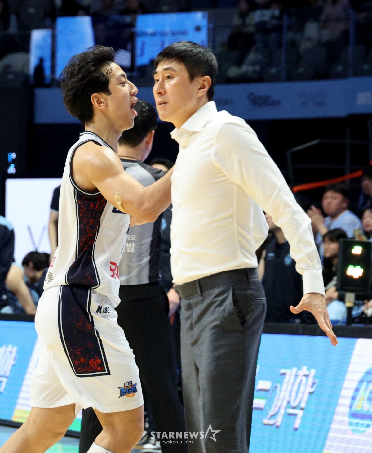 KCC 허훈이 4일 고양소노아레나에서 열린 2025-2026 LG전자 프로농구 고양소노와 부산KCC 경기 3쿼터 역전을 만들어낸 후 환호하고 있다. 오른쪽은 이상민 감독. 2026.02.04.