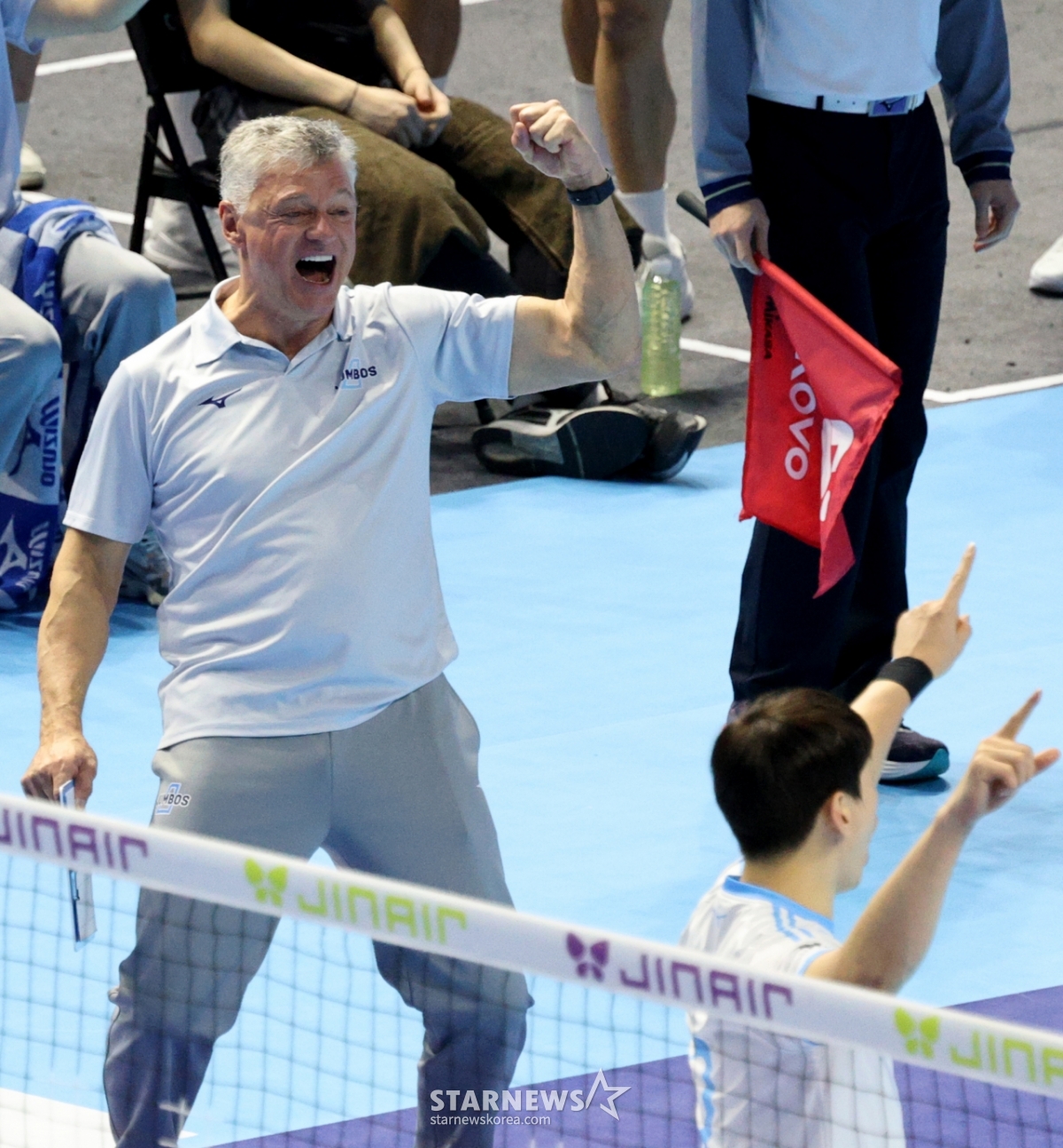 대한항공 헤난 감독이 7일 계양체육관에서 열린 2025-2026 진에어 V리그 남자부 대한항공과 한국전력의 경기에서 득점에 환호하고 있다. 2026.02.07.