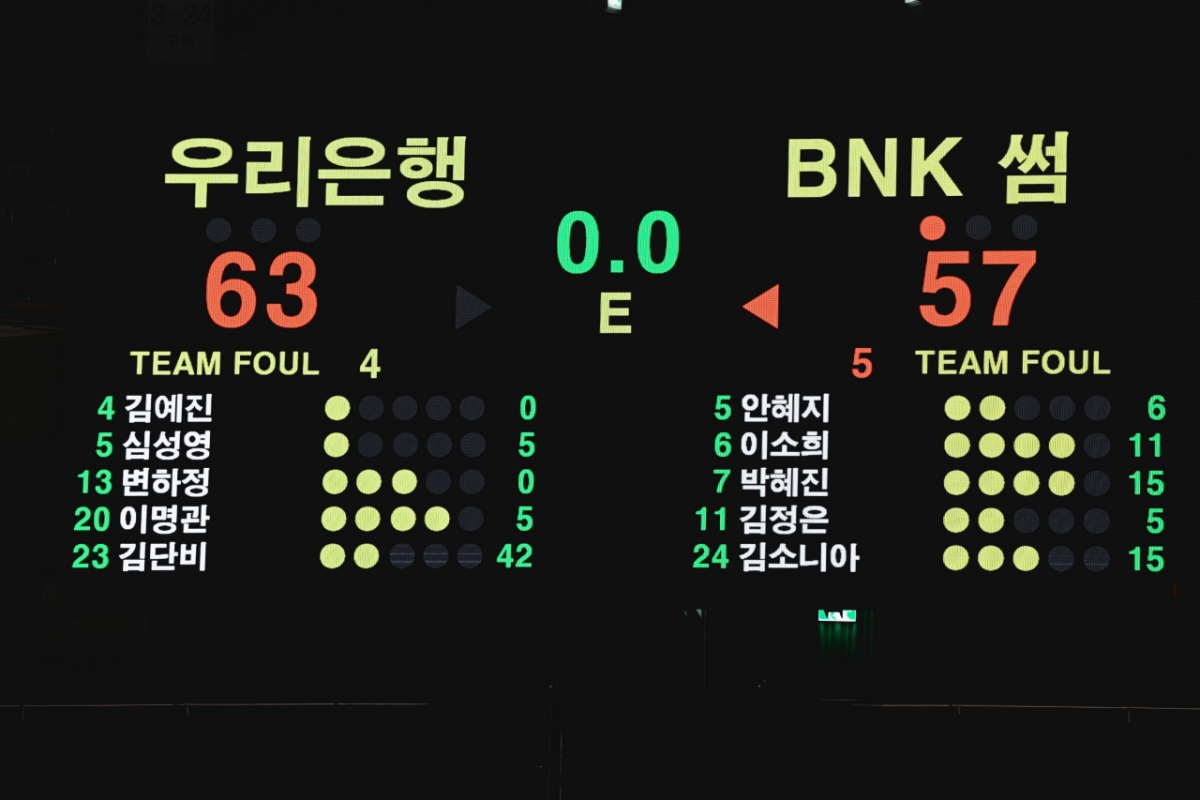 연장전에서 승부가 결정됐다. 김단비는 연장전에서도 쉬지 않고 득점포를 가동하며 BNK 수비진을 무너뜨렸다. 종료 1분 40여 초를 남기고 김정은을 따돌린 뒤 레이업을 올려놨다. 커리어 하어 달성이자 이날 결승 득점이었다. 우리은행은 경기 막판 이명관과 심성영이 상대 반칙으로 얻어낸 자유투를 침착하게 모두 성공하며 6점 차 승리를 확정 지었다.
