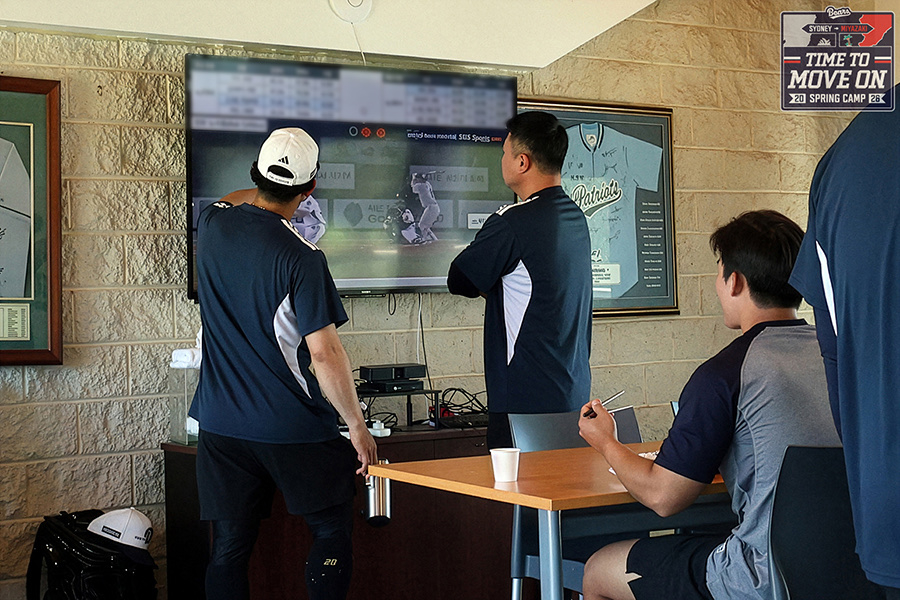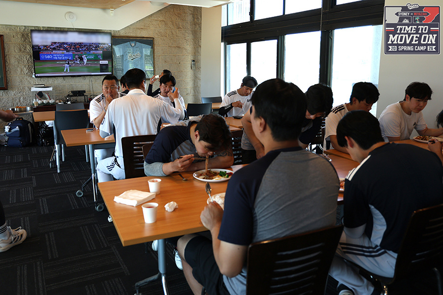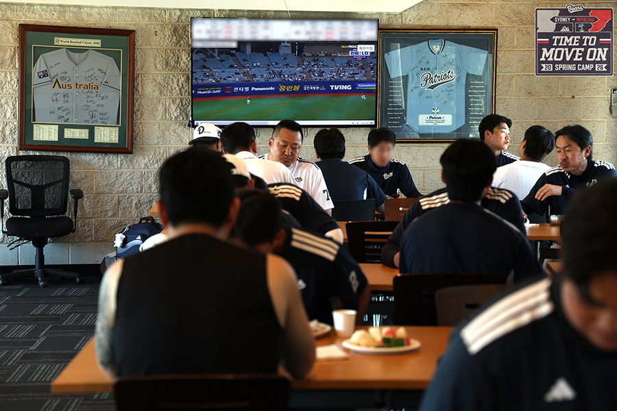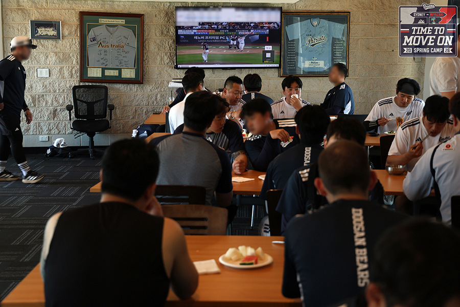 두산의 1차 스프링캠프지인 호주 시드니. 두산 관계자에 따르면 선수들은 점심 식사 중 휴대전화를 보거나 사담을 나누는 대신, 텔레비전을 통해 타 구단 선수들의 영상 자료를 매일같이 확인하고 있다고 한다.