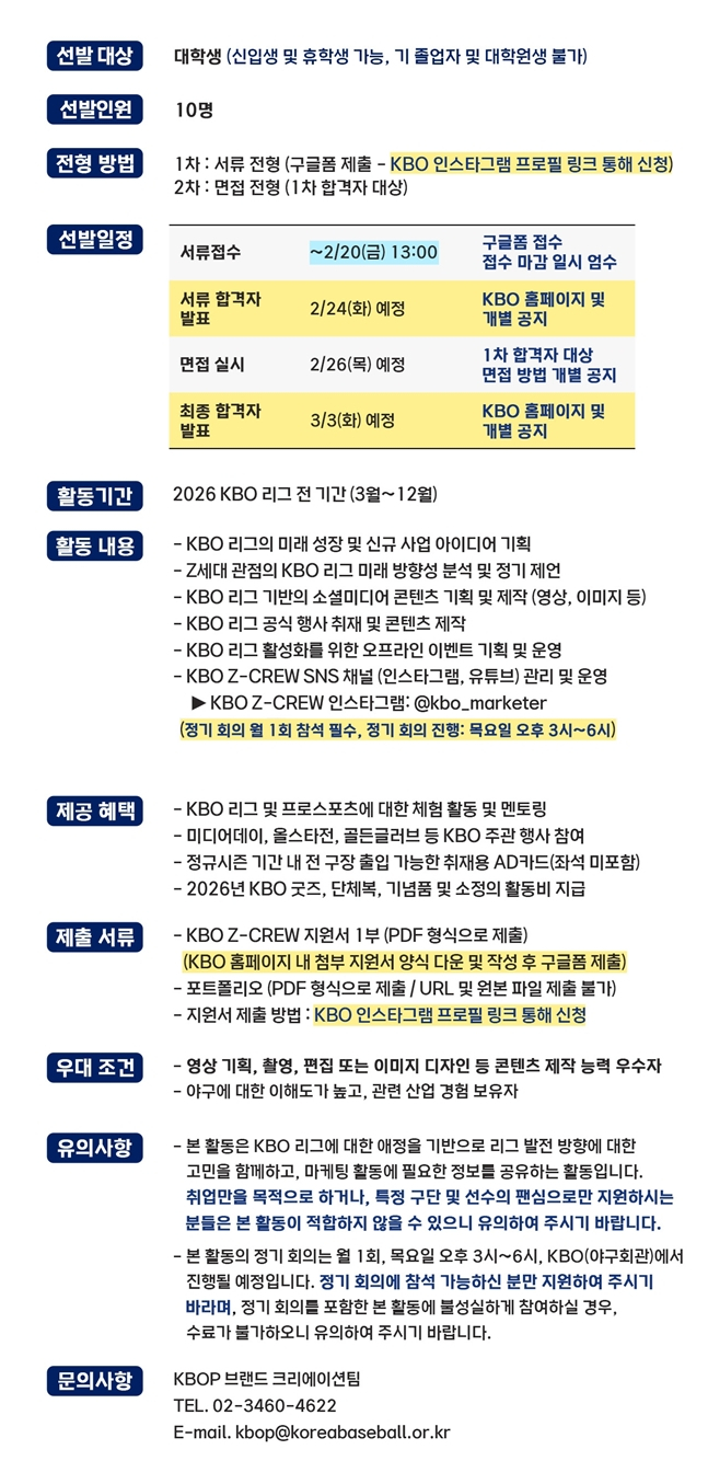 최종 선발된 KBO Z-CREW에게는 KBO 리그 정규시즌 기간 전 구장 출입이 가능한 2026 시즌 AD 카드, KBO 굿즈, 활동비가 지급된다.