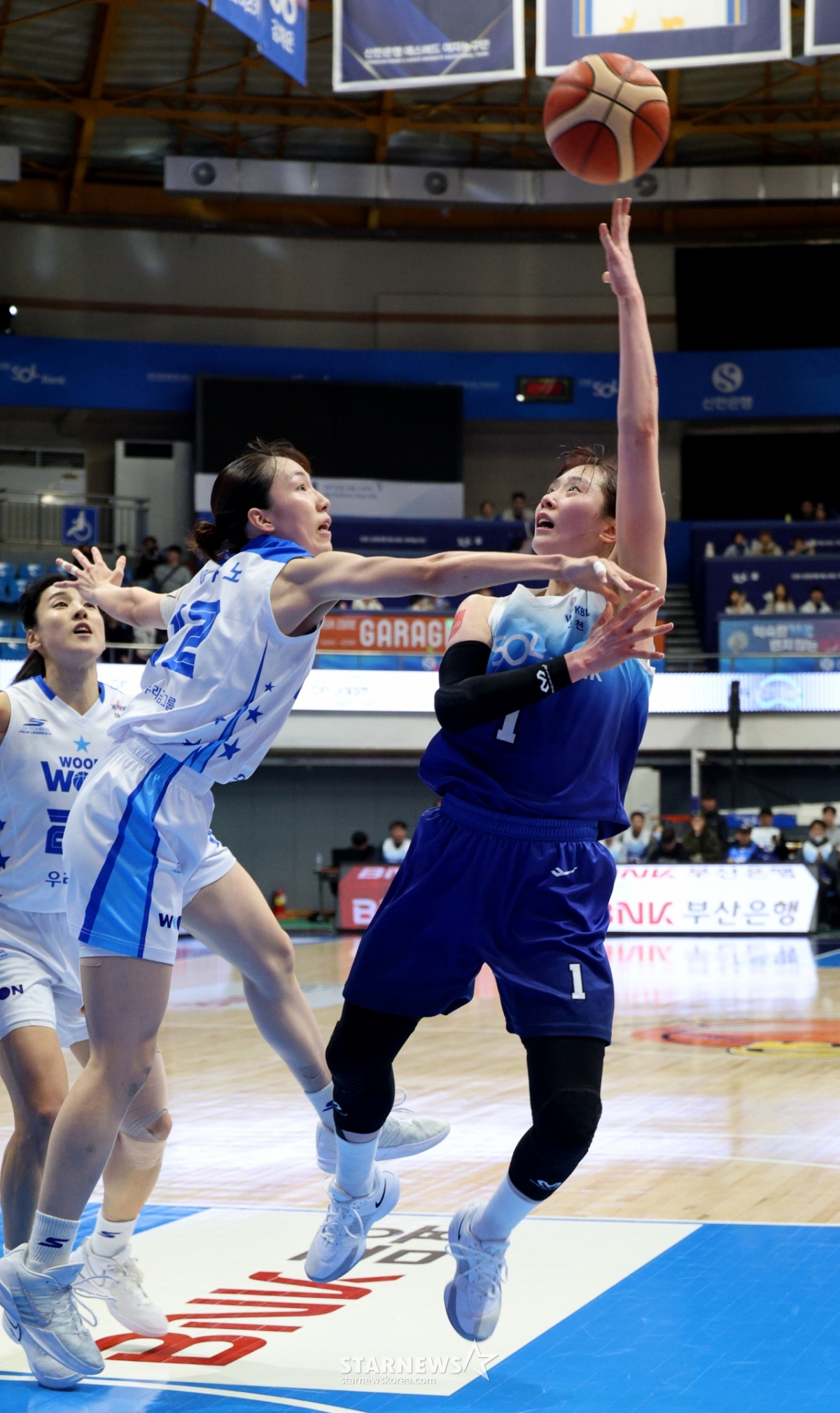 신한 신이슬이 11일 인천 도원체육관에서 열린 2025-2026WKBL 신한은행과 우리은행경기에서 아야노를 따돌리며 레이업슛을 시도하고 있다. 2026.02.11.