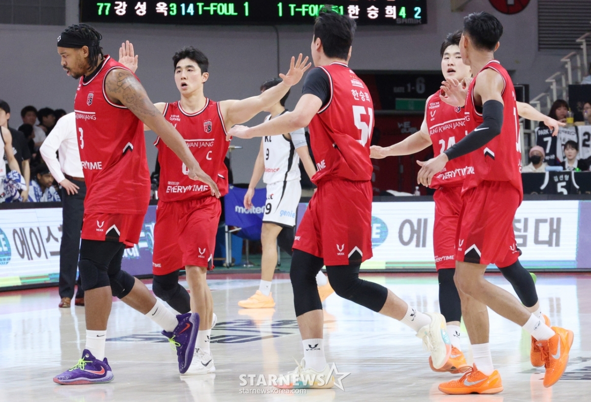정관장 박지훈이 결정적인 득점을 한 후 작전타임 휘슬이 울리자 동료들과 기뻐하며 벤치로 향하고 있다.