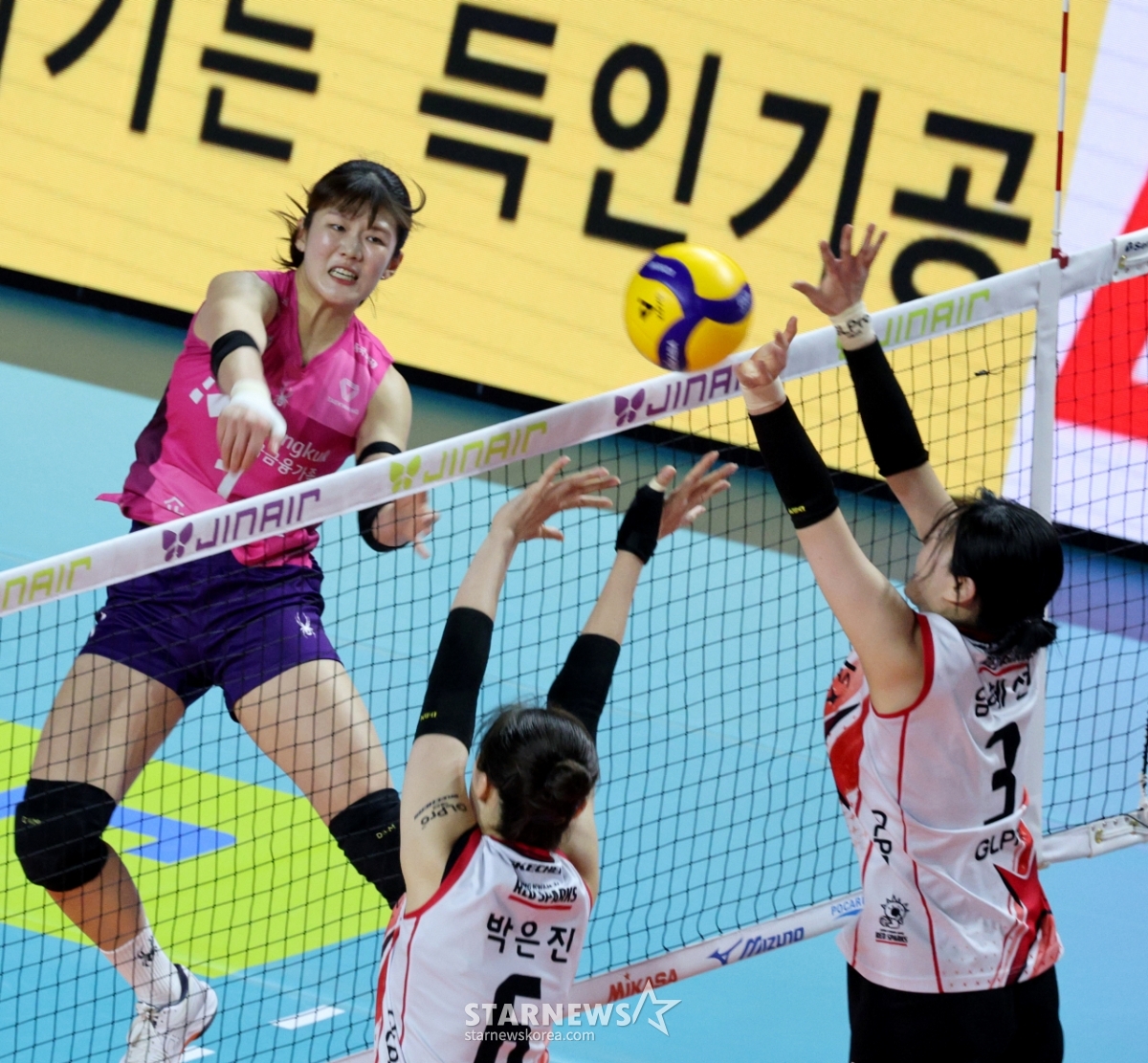 흥국생명 김다인이 14일 삼산월드체육관에서 열린 2025-2026 진에어 V리그 흥국생명과 정관장 경기에서 강타를 터트리고 있다. 2026.02.14.