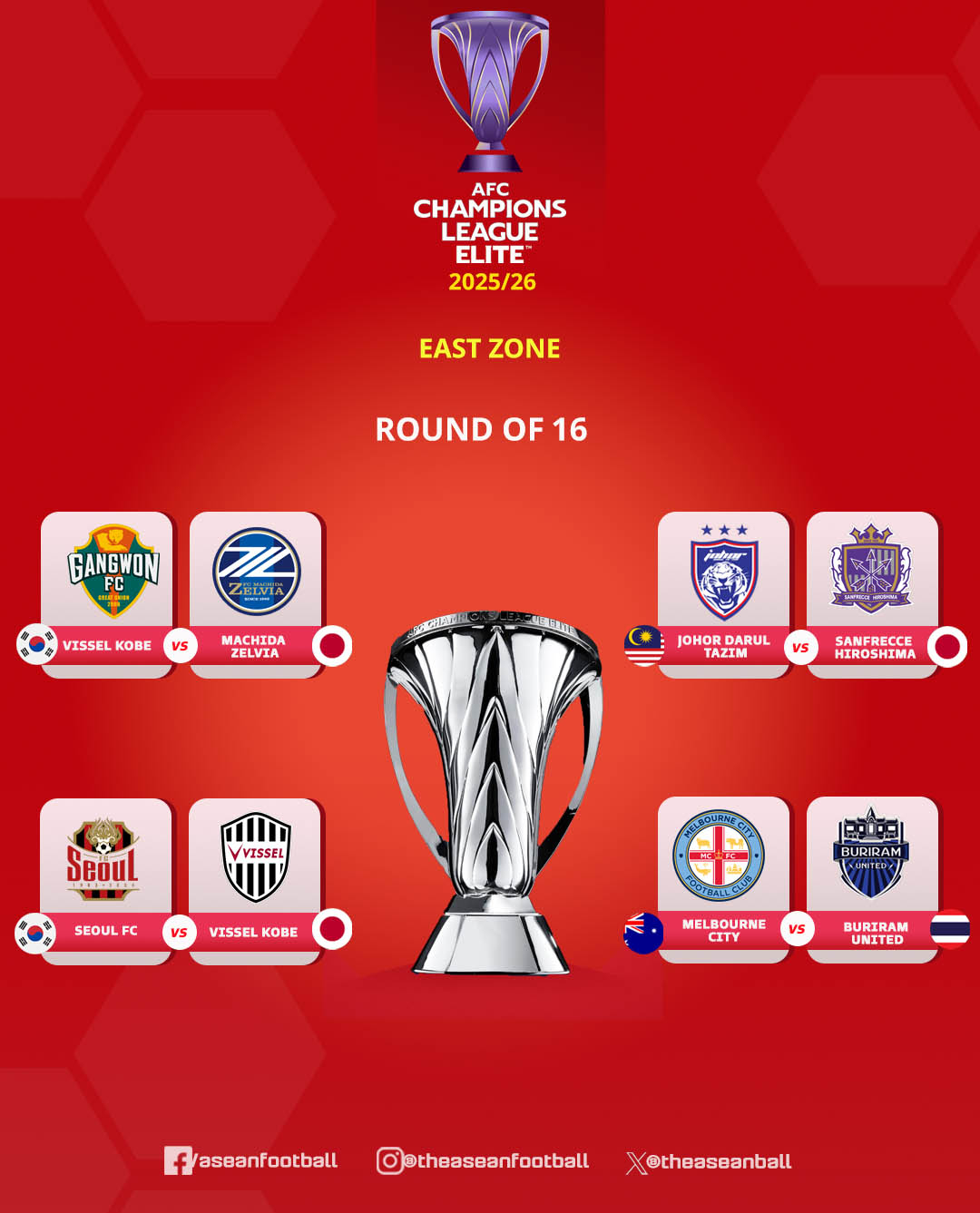 이밖에 다른 동아시아 지역 16강 대진은 산프레체 히로시마(일본·3위)와 조호르 다룰 탁짐(말레이시아·6위), 부리람 유나이티드(태국·4위)와 멜버른 시티(호주·5위)의 맞대결로 구성됐다. 동아시아 지역 1차전은 내달 3~4일, 2차전은 10~11일에 걸쳐 홈 앤드 어웨이 방식으로 열린다. 서울, 강원 등 리그 스테이지 순위가 더 낮은 팀의 홈에서 먼저 1차전이 열린다.