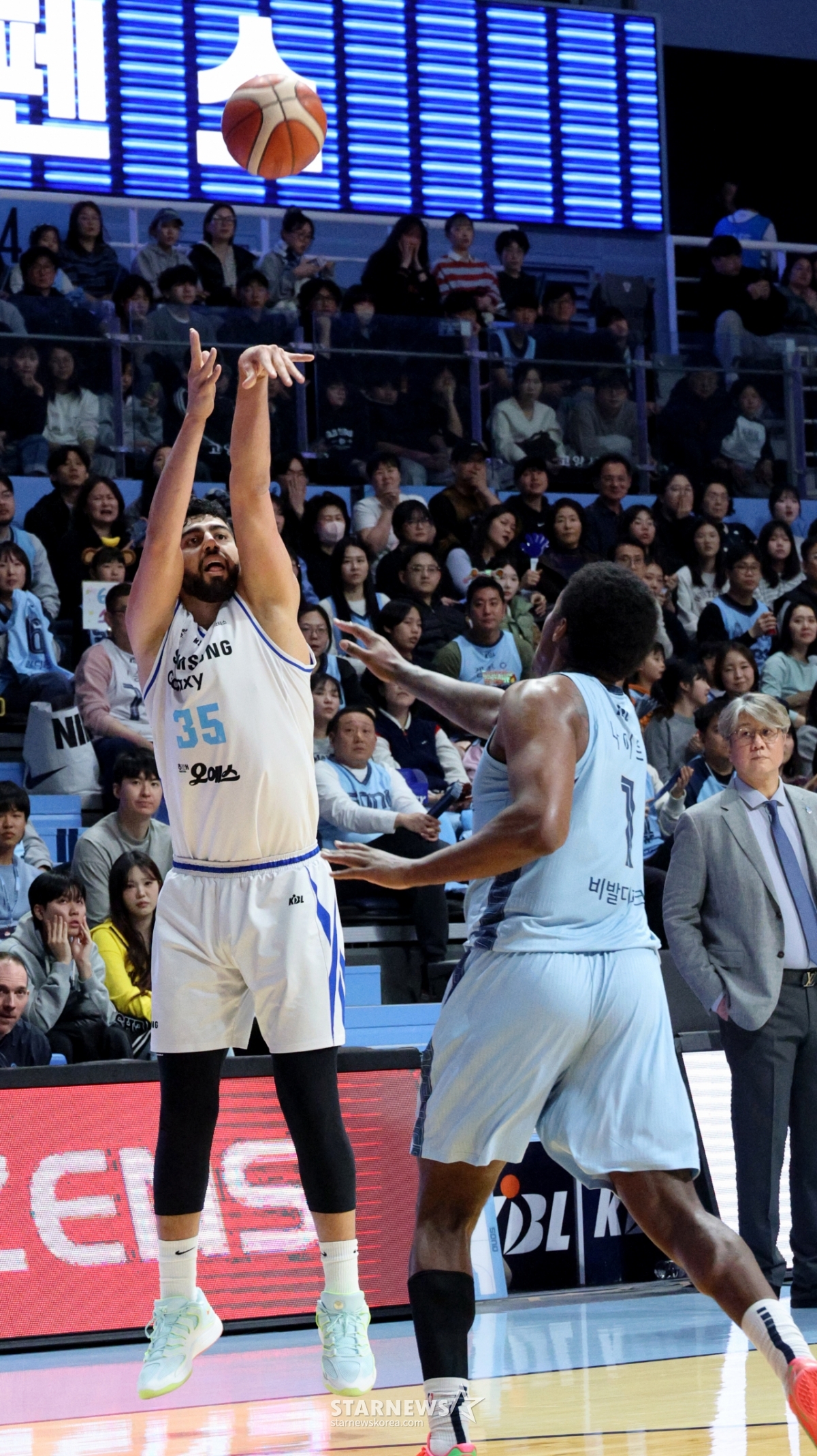 삼성 칸터가 19일 고양소노아레나에서 열린 2025-2026 LG전자 프로농구 고양소노와 서울삼성의 경기에서 나이트를 따돌리며 중거리슛을 시도하고 있다. 2026.02.19.