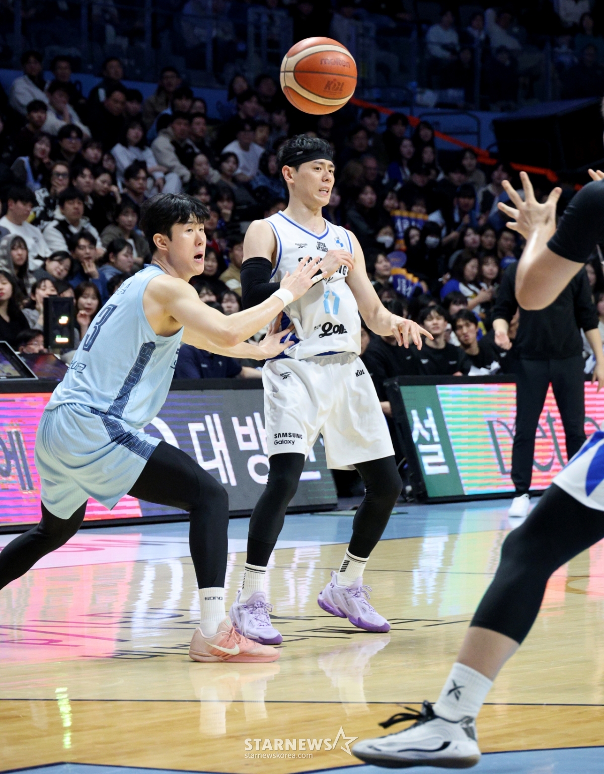 삼성 이관희가 2025-2026 LG전자 프로농구 고양소노와 서울삼성의 경기에서 골밑으로 노룩패스를 하고 있다.