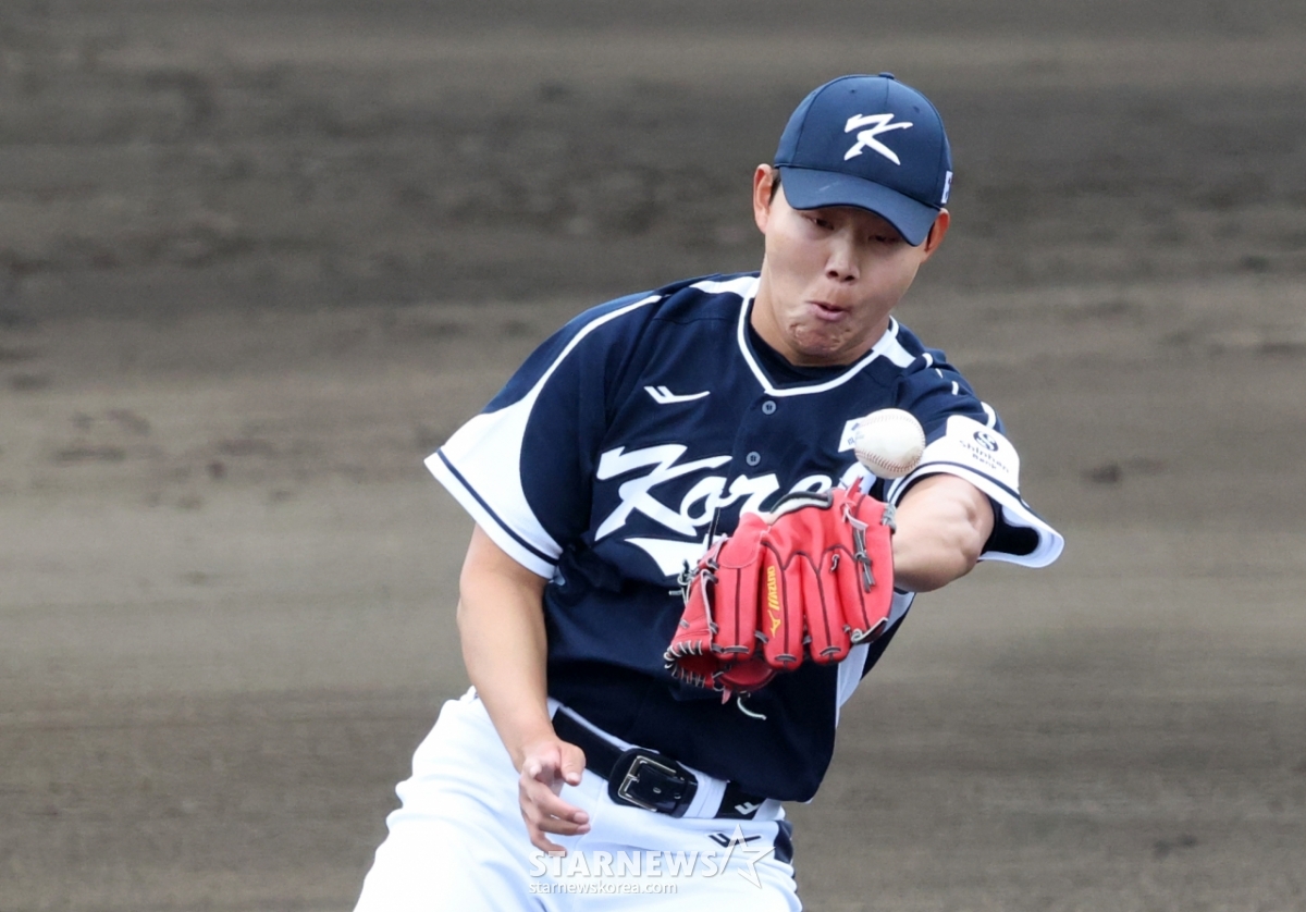 대표팀 선발 소형준이 강습 타구를 수비하고 있다.