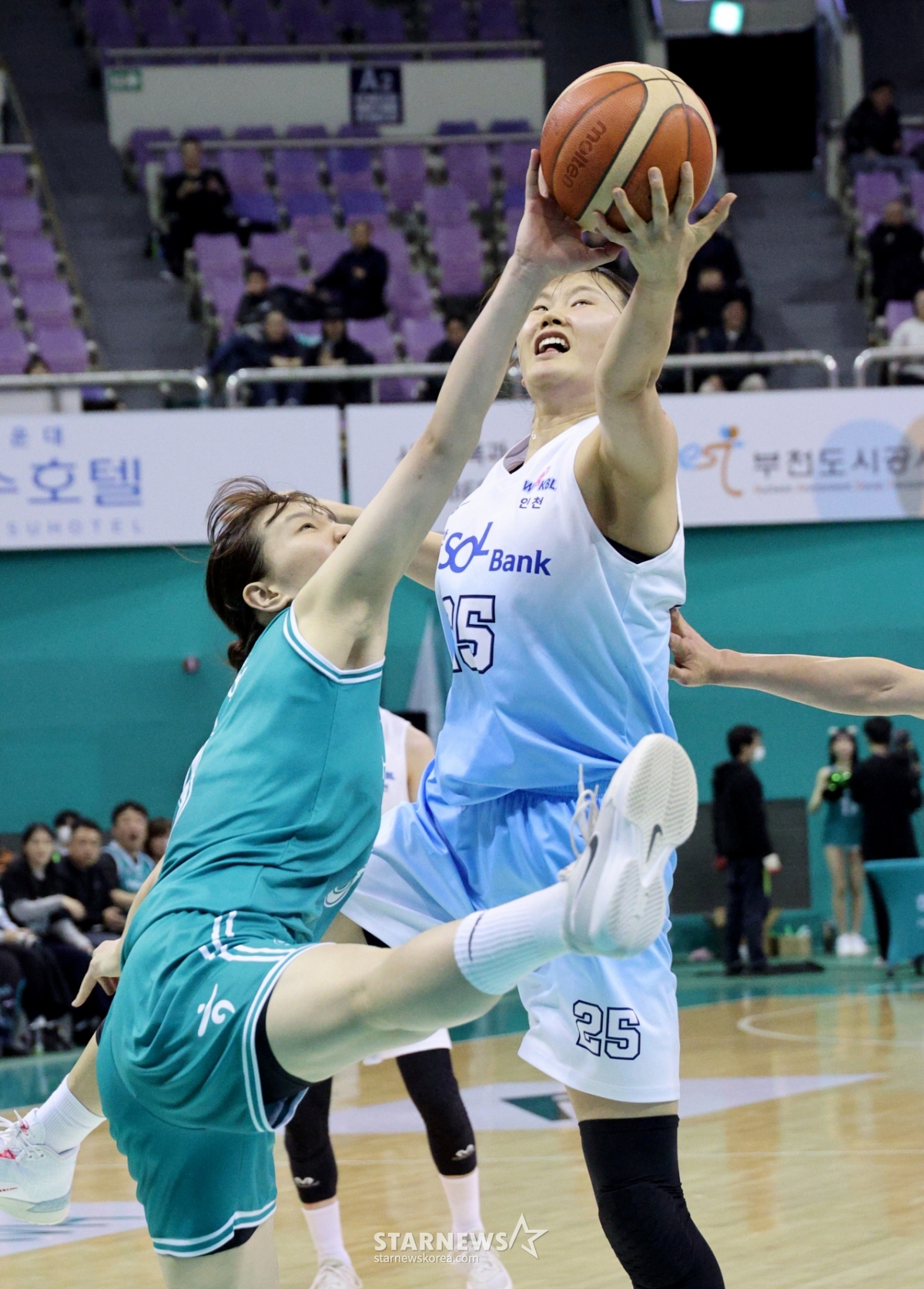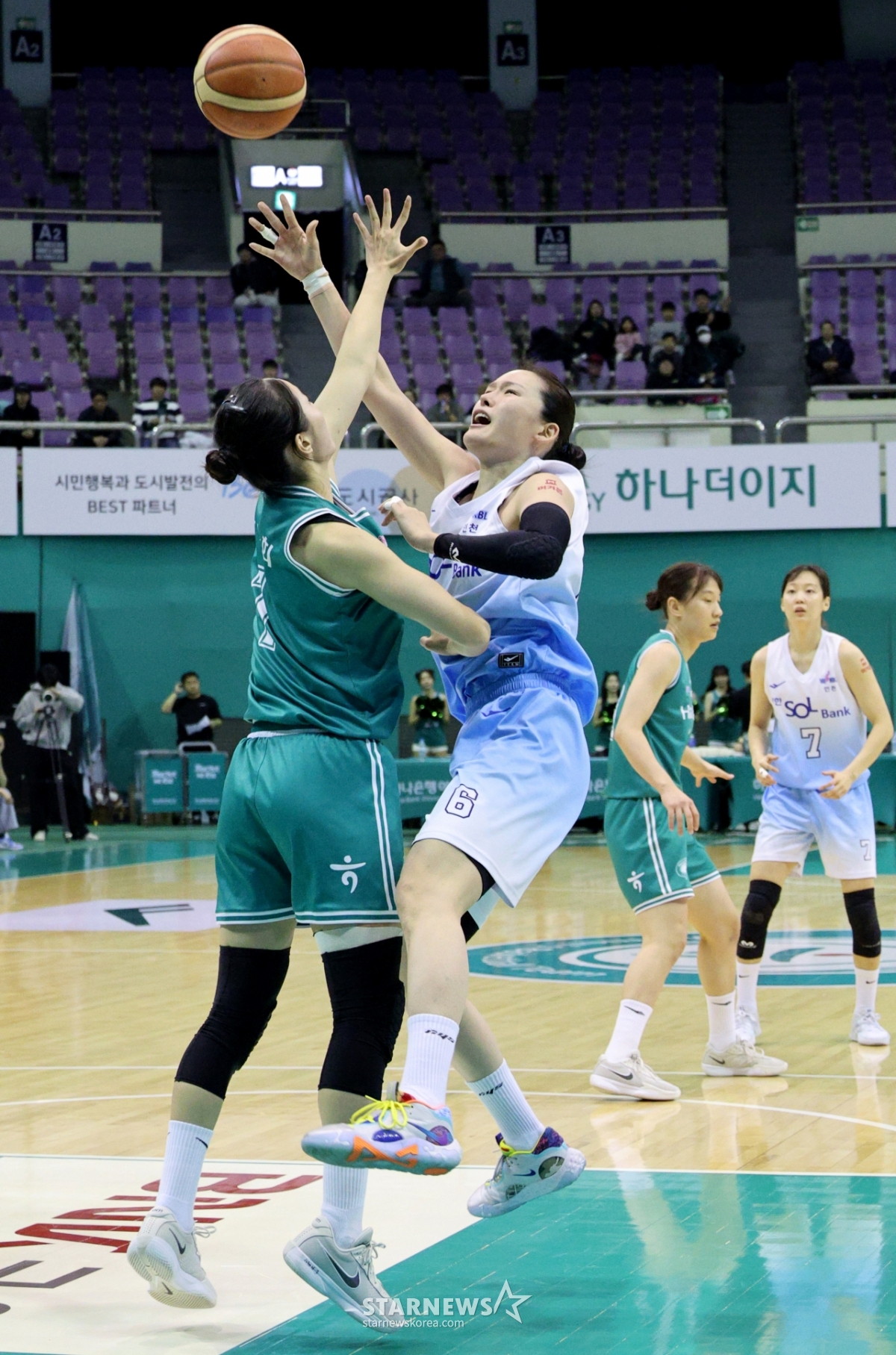 신한 미마 루이가 20일 부천실내체육관에서 열린 BNK금융 2025-2026 WKBL 하나은행과 신한은행 경기에서 정현과 치열한 리바운드 다툼을 벌이고 있다.