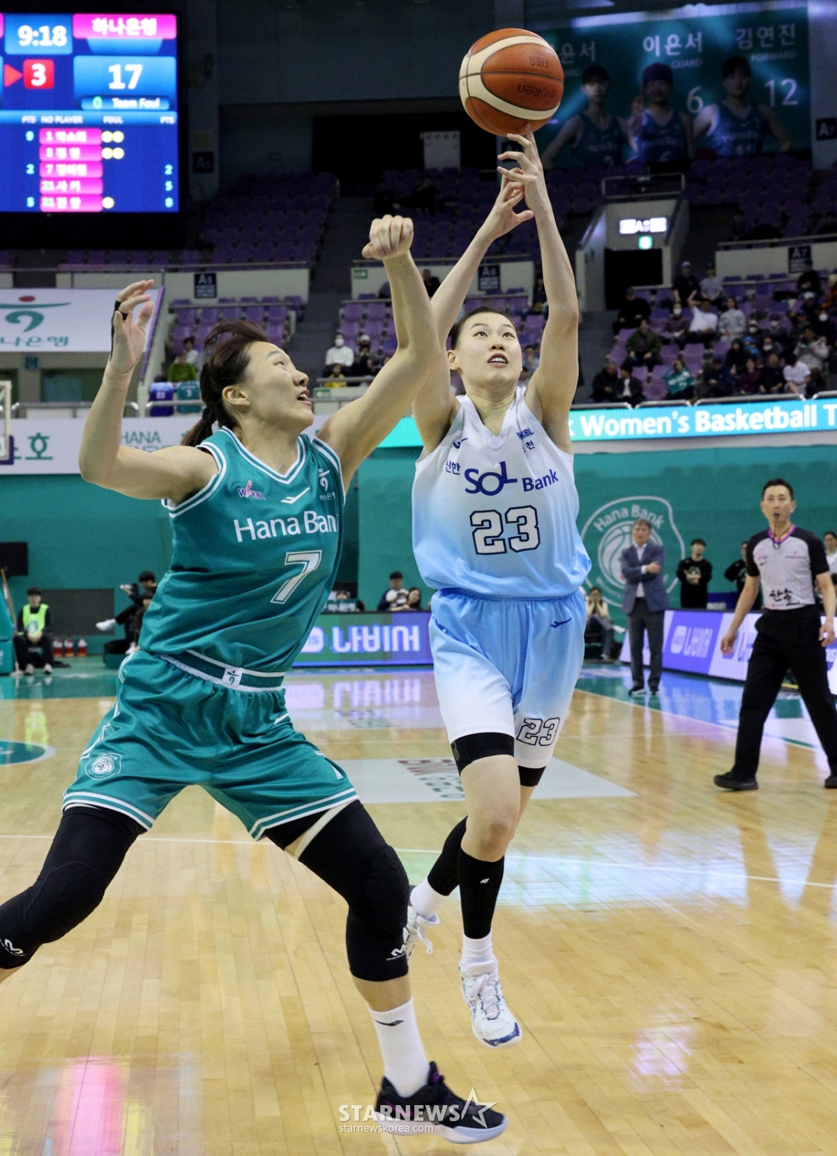 20일 부천실내체육관에서 열린 BNK금융 2025-2026 WKBL 하나은행과 신한은행 경기 2쿼터가 끝나기 14초를 남기고 하나은행이18점, 신한은행이 15점을 기록하고 있다.