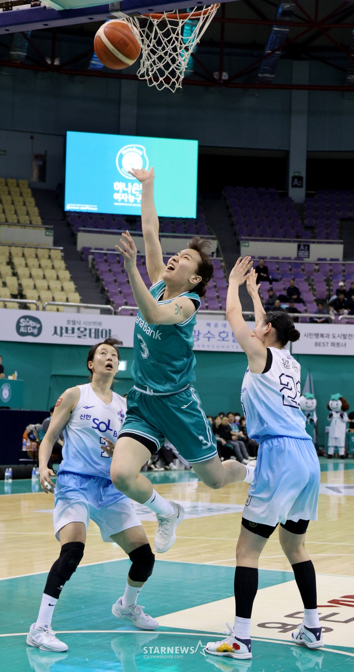 전광판엔 3분 25초를 남기고 47-35로 신한이 앞서있다