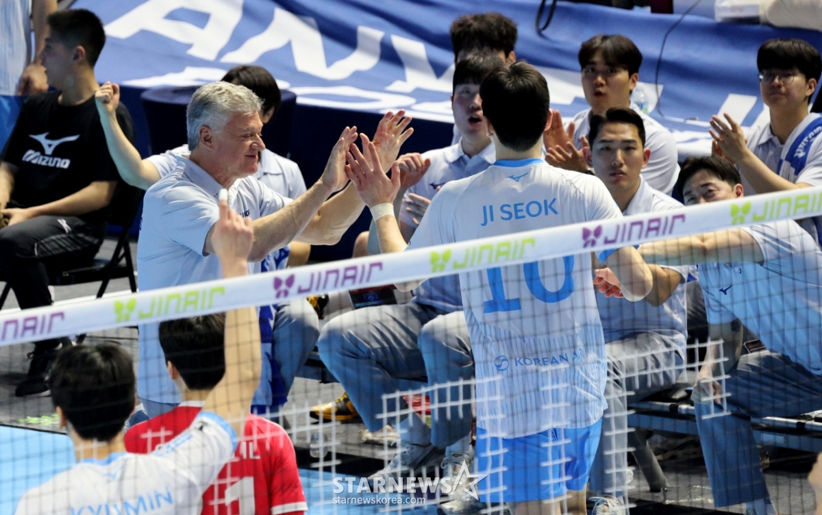 대한항공 헤난 감독이 계양체육관에서 열린 대한항공과 현대캐피탈 경기에서 득점한 정지석과 함께 기뻐하고 있다. 현대캐피탈은 대한항공과의 승점 2점차로 1위를 유지하고 있다.