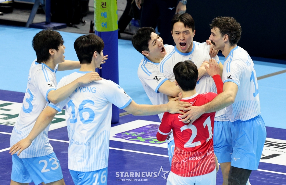 대한항공 정지석과 선수들이 22일 계양체육관에서 열린 진에어 2025-2026V리그 대한항공과 현대캐피탈 경기에서 득점후 환호하고 있다. 2026.02.202.