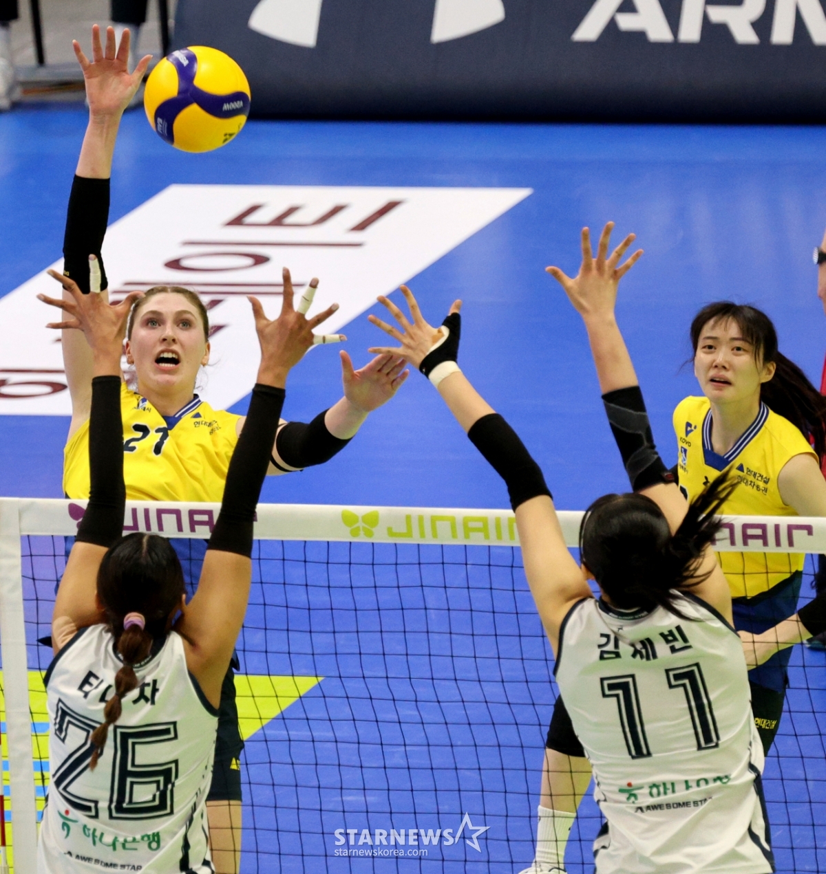 현대 카리가 24일 수원체육관에서 열린 진에어 2025-2026V리그 여자부 현대건설과 한국도로공사 경기에서 연타를 시도하고 있다.. 2026.02.24.