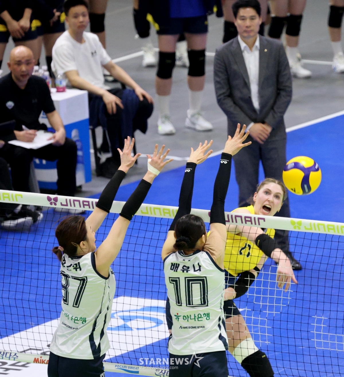 현대 카리가 24일 수원체육관에서 열린 진에어 2025-2026V리그 여자부 현대건설과 한국도로공사 경기에서 도로공사 블로킹을 피해 강타를 터트리고 있다.. 2026.02.24.