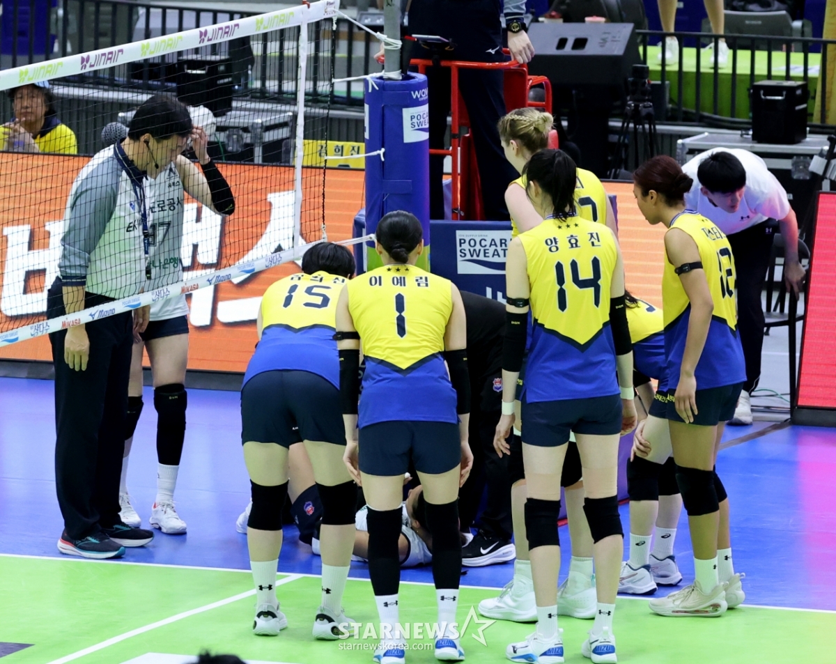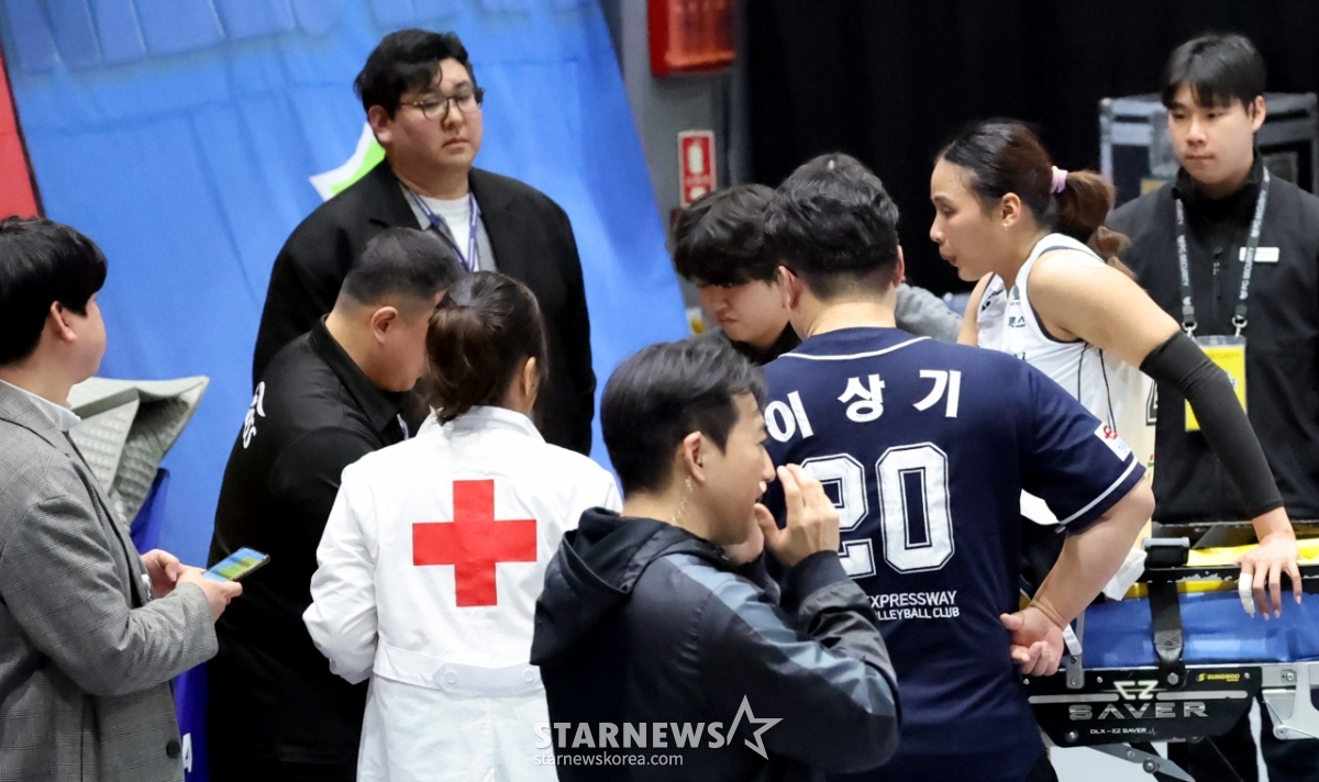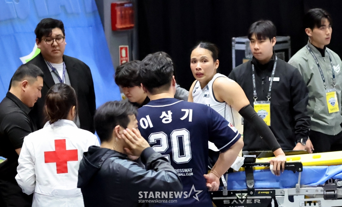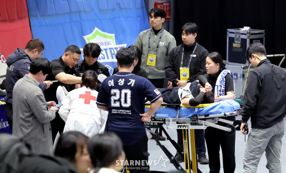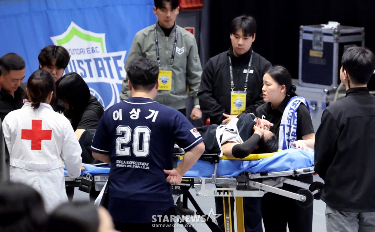 도로공사 타나차가 24일 수원체육관에서 열린 진에어 2025-2026V리그 여자부 현대건설과 한국도로공사 경기 5세트 부상으로 들것에 실려나와 응급처리를 받고 있다.. 2026.02.24.