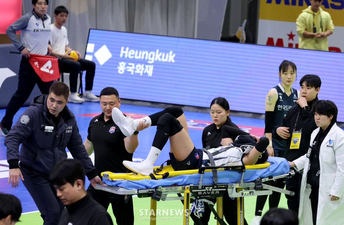 도로공사 타나차가 24일 수원체육관에서 열린 현대건설과의 경기에서 5세트 중 부상을 당해 들것에 실려 응급처리를 받았다.