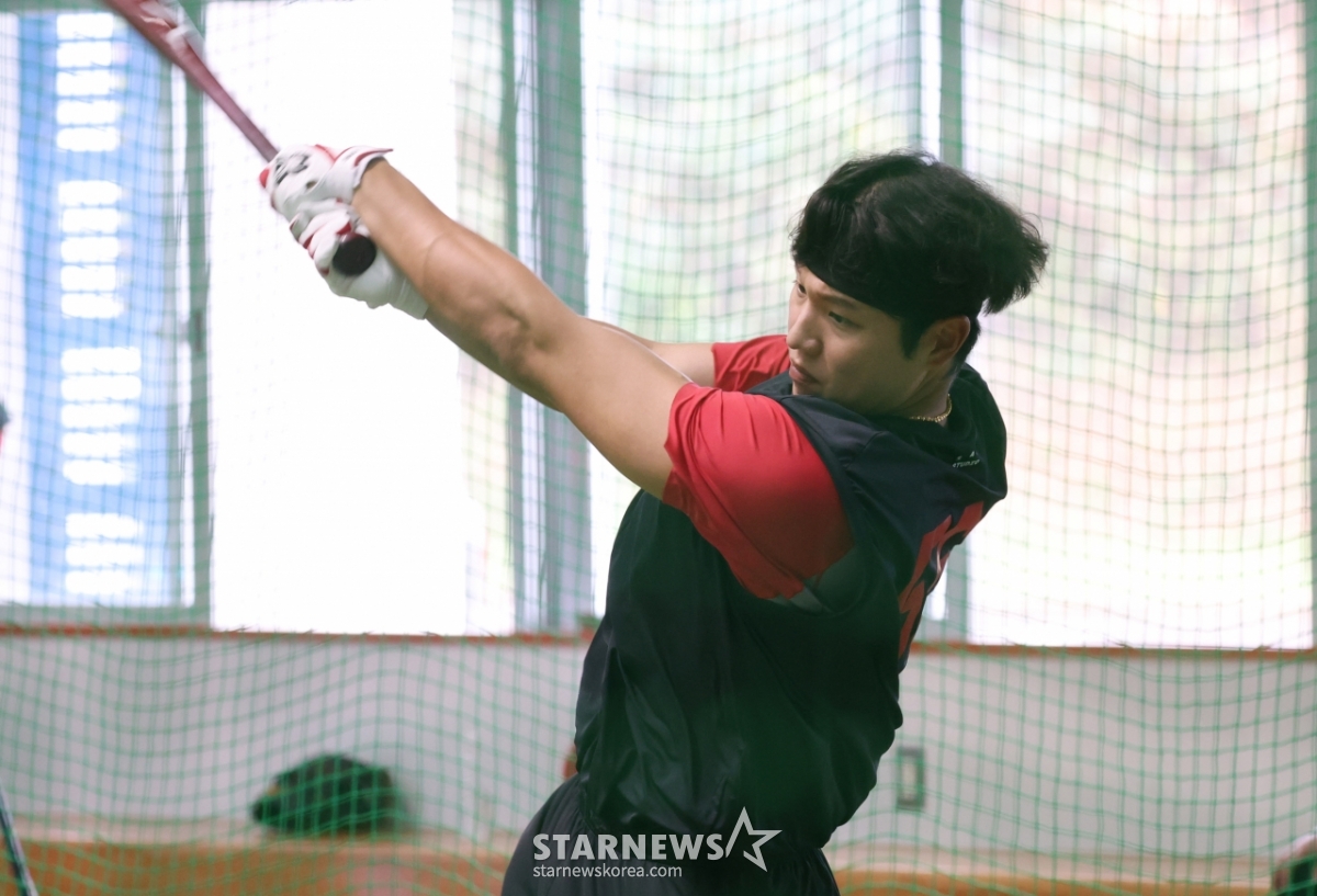 오선우가 타격 훈련을 하고 있다.