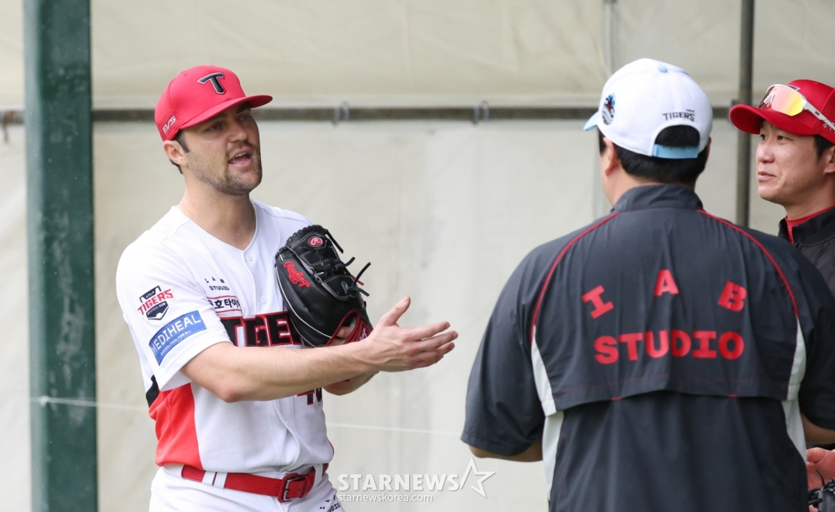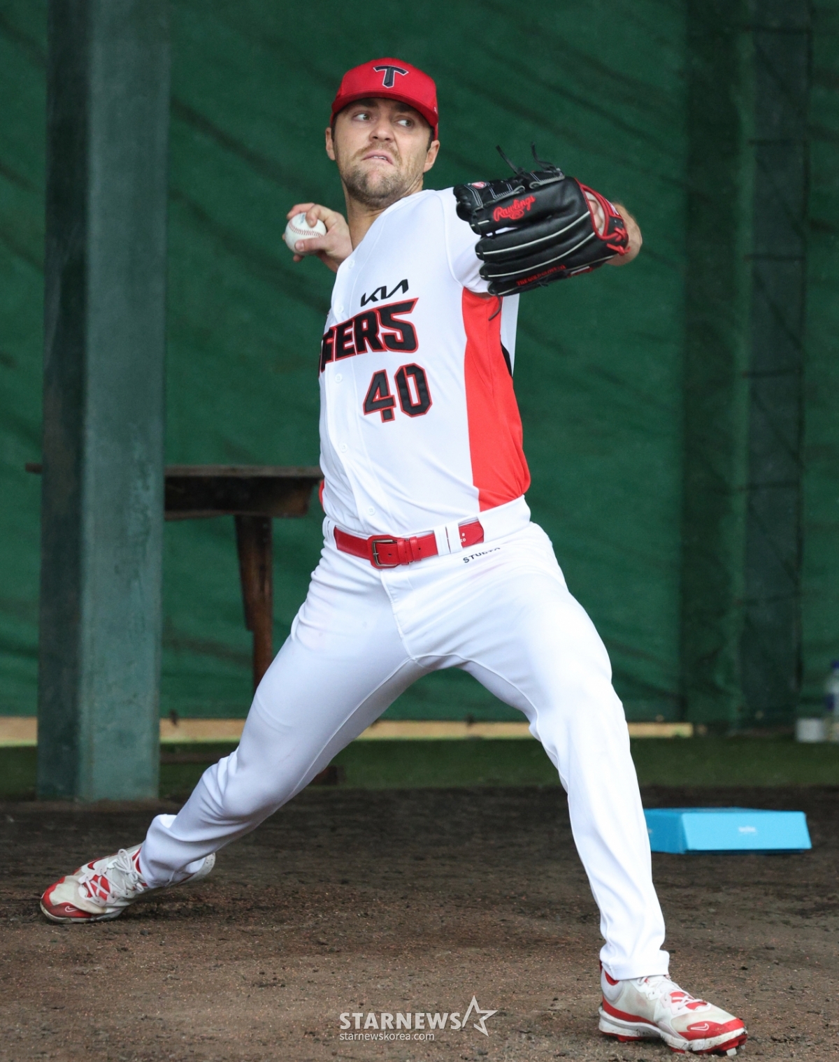 우천으로 실내 훈련이 확정된 가운에 외인 에이스 네일이 불펜 피칭을 하며 호랑이 군단의 훈련이 시작됐다.