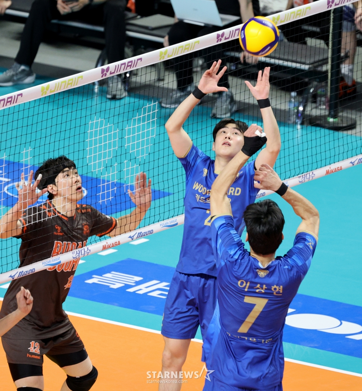 한태준 선수가 25일 장충체육관에서 열린 V리그 남자부 우리카드와 OK저축은행 경기에 출전하여 이상헌과 속공을 시도했다.