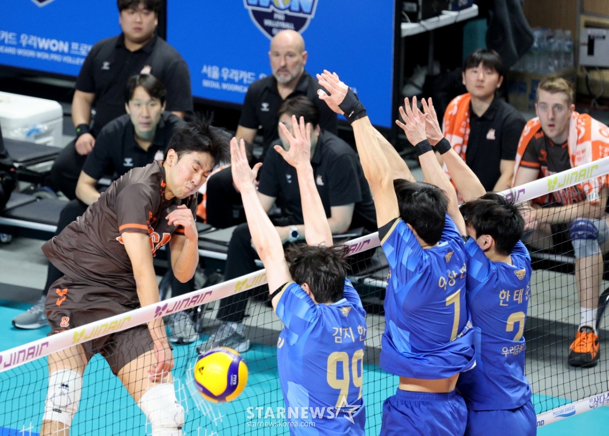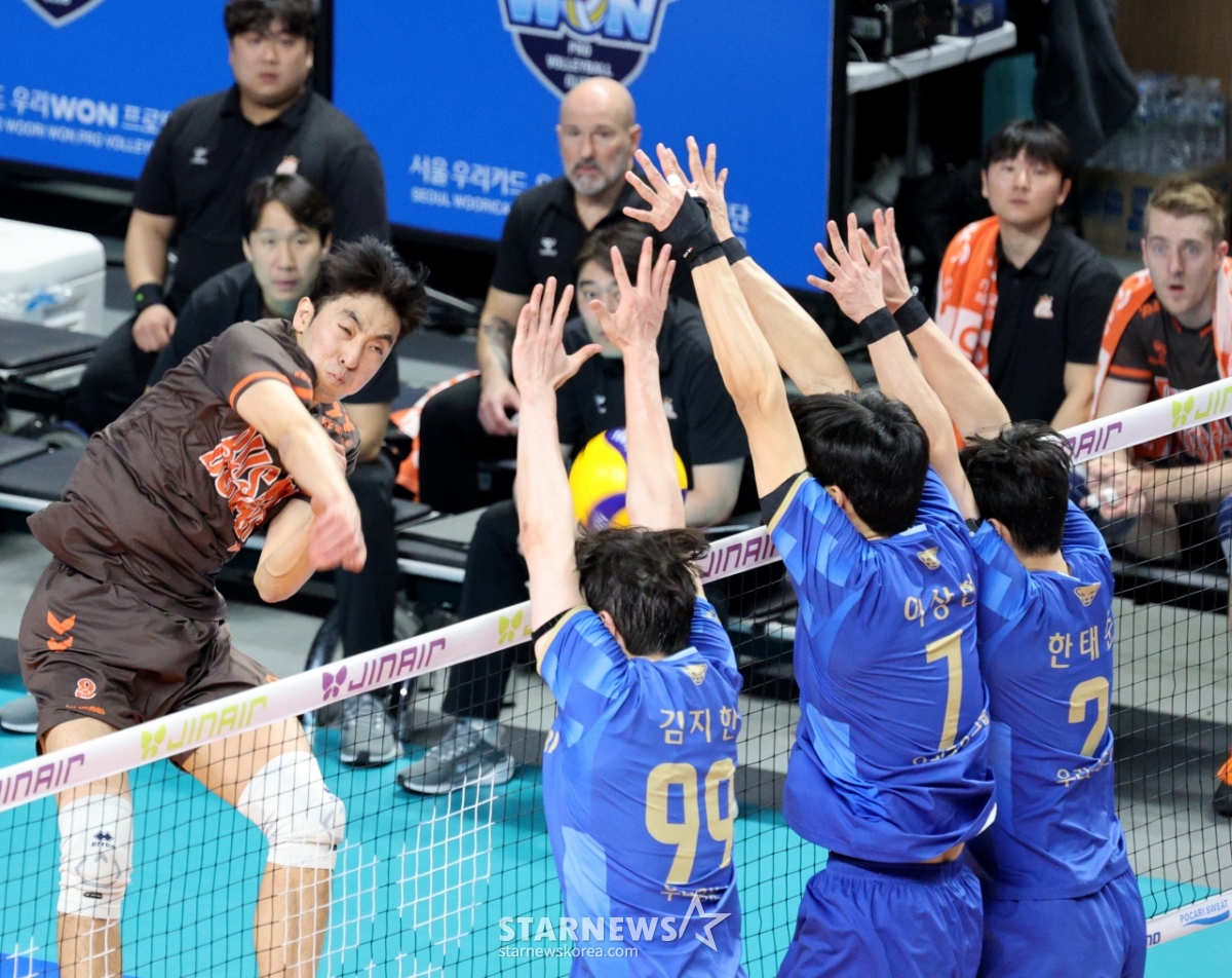 OK 차지환이 25일 장충체육관에서 열린 진에어 2025-2026V리그 남자부 우리카드와 OK저축은행과의 경기에서 우리 삼중블로킹에 강타를 터트리고 있다.. 2026.02.25.