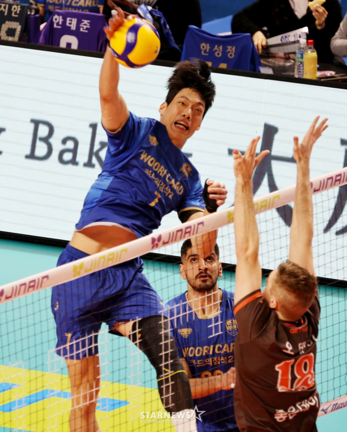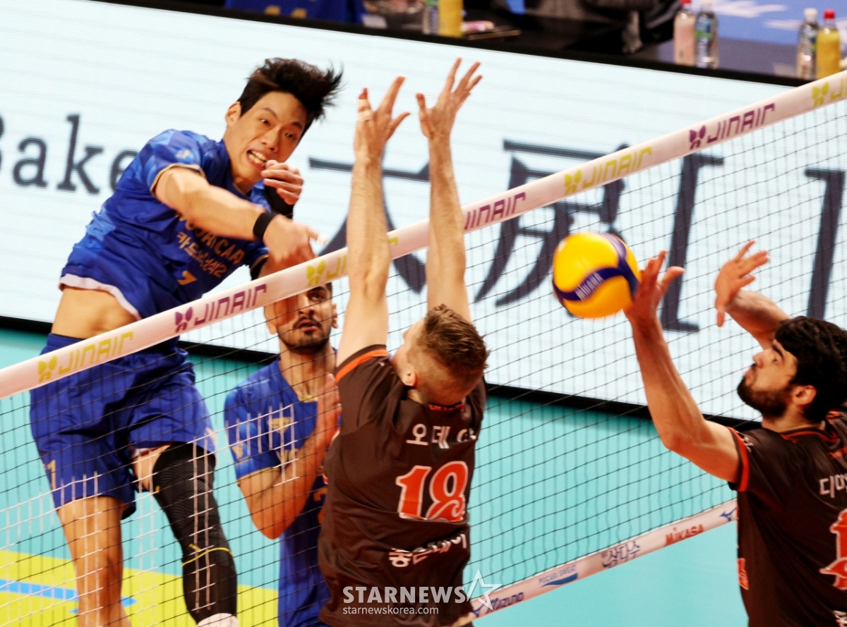 이상현 선수가 2월 25일 장충체육관에서 열린 V리그 남자부 우리카드와 OK저축은행 경기에서 속공을 성공시켰다.