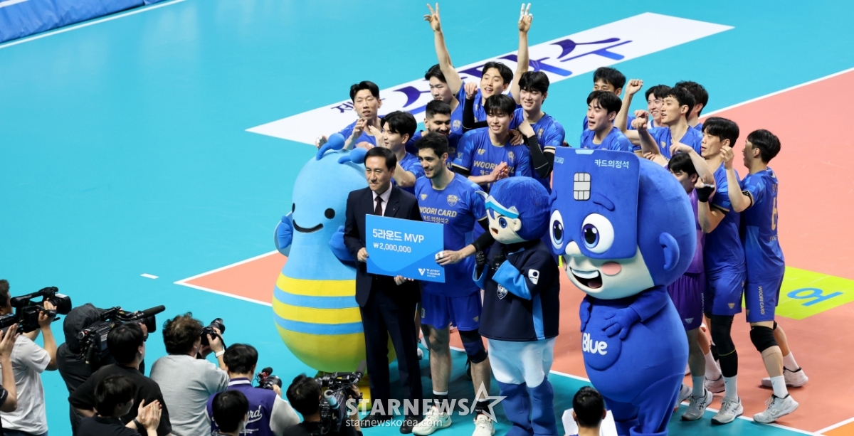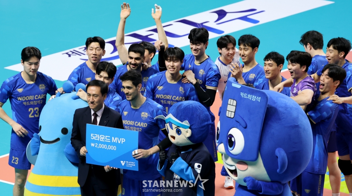 우리 선수들이 25일 장충체육관에서 열린 진에어 2025-2026V리그 남자부 우리카드와 OK저축은행과의 경기에 앞서 진행된 5라운드MVP시상식에서 아라우조를 축하하고 있다.. 2026.02.25.