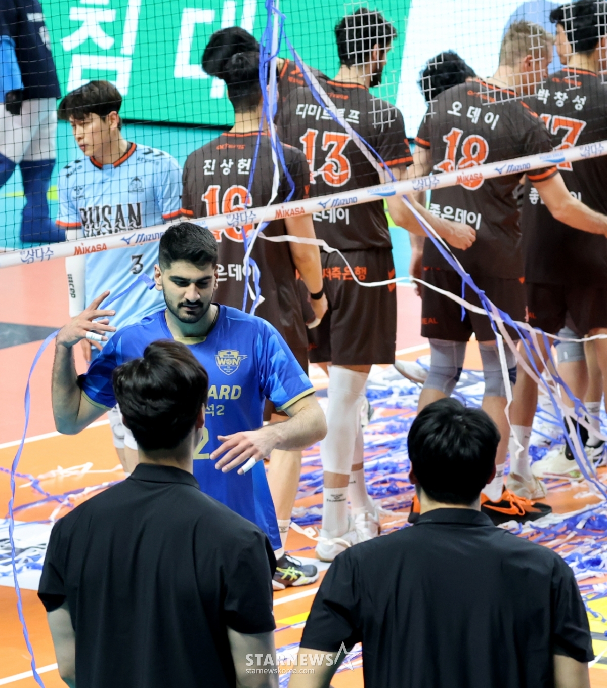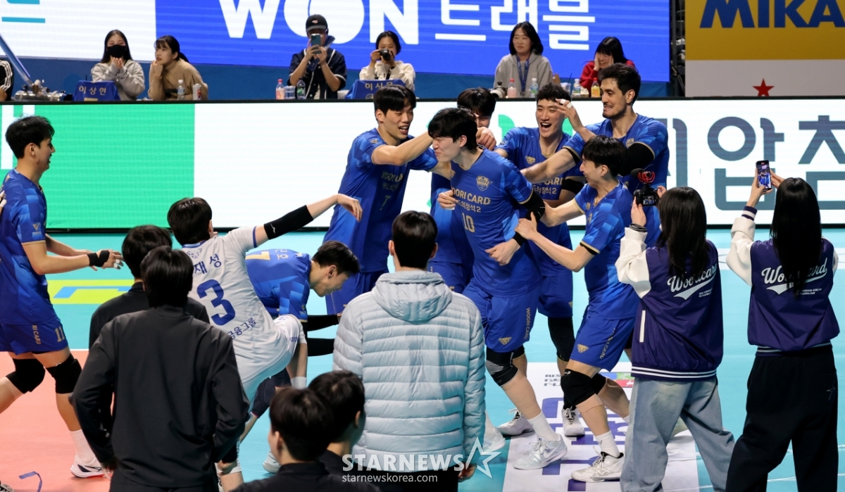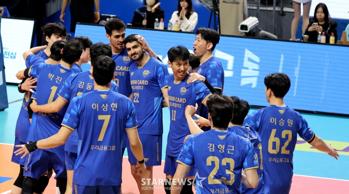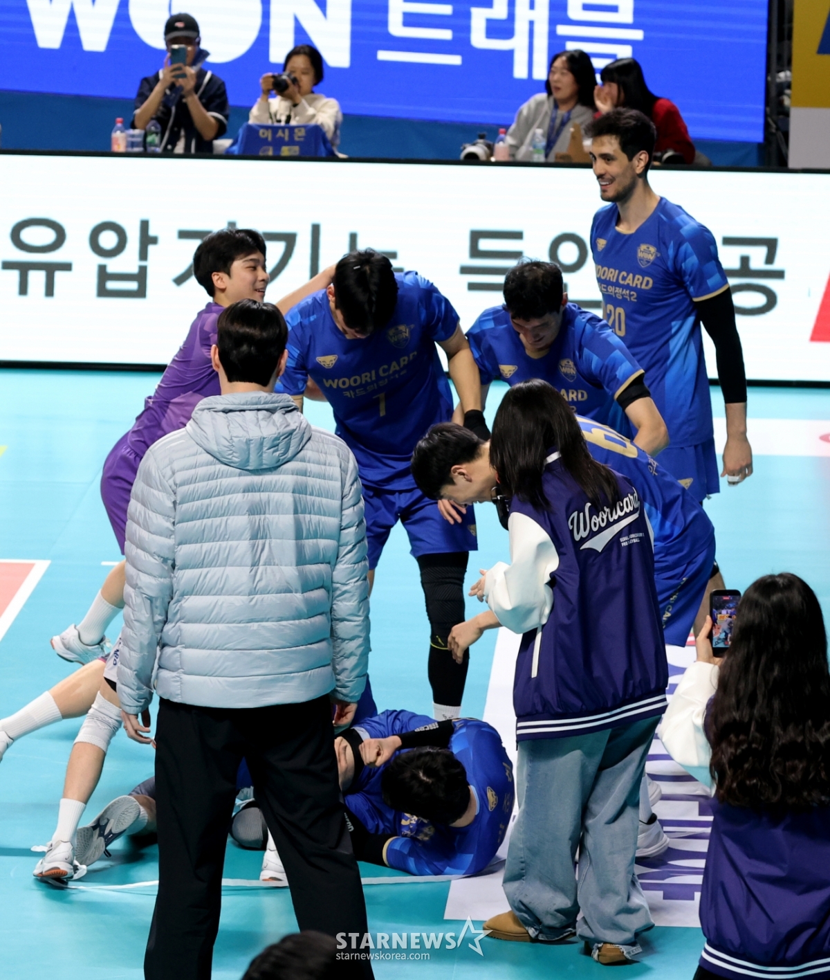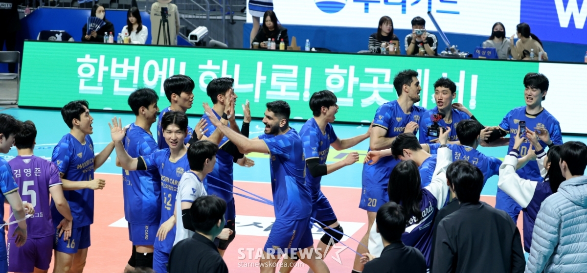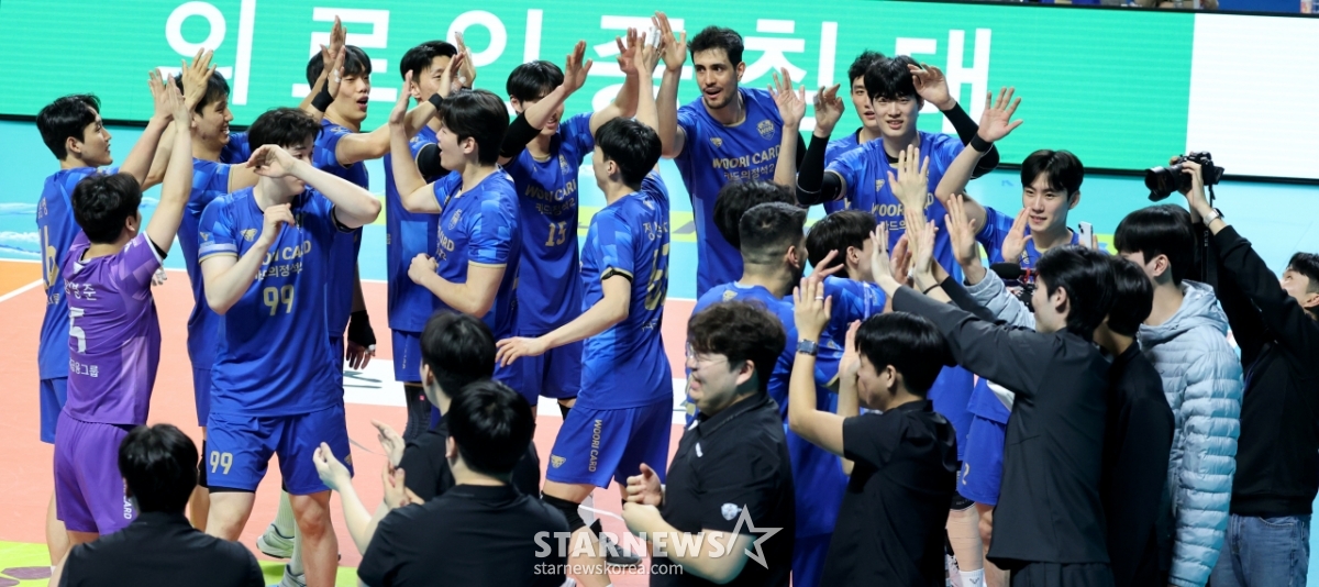 우리 아라우조와 선수들이 25일 장충체육관에서 열린 진에어 2025-2026V리그 남자부 우리카드와 OK저축은행과의 경기에서 승리한 후 자축하고 있다. 우리가 OK를 내리며 5위로 올라섰다.2026.02.25.