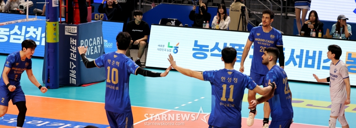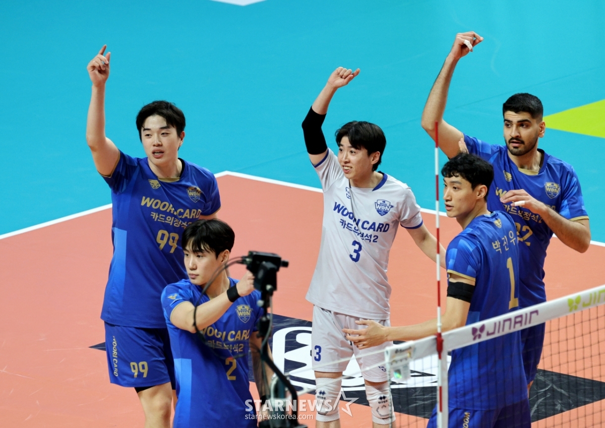 우리카드가 OK저축은행을 3-1로 제압하며 5위로 올라섰다.