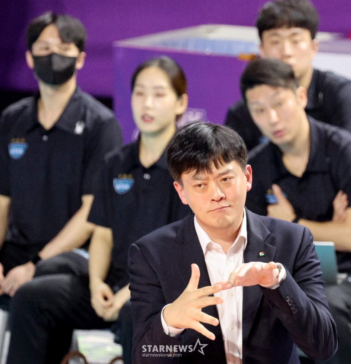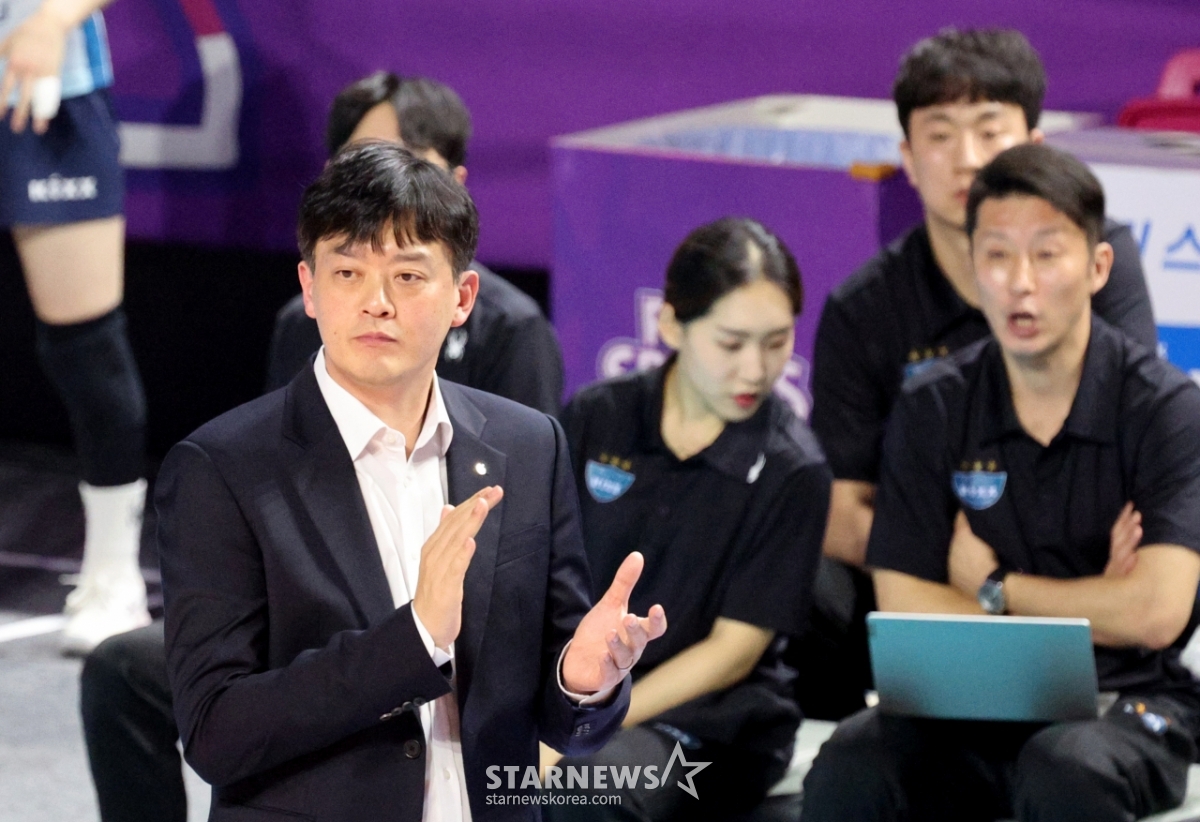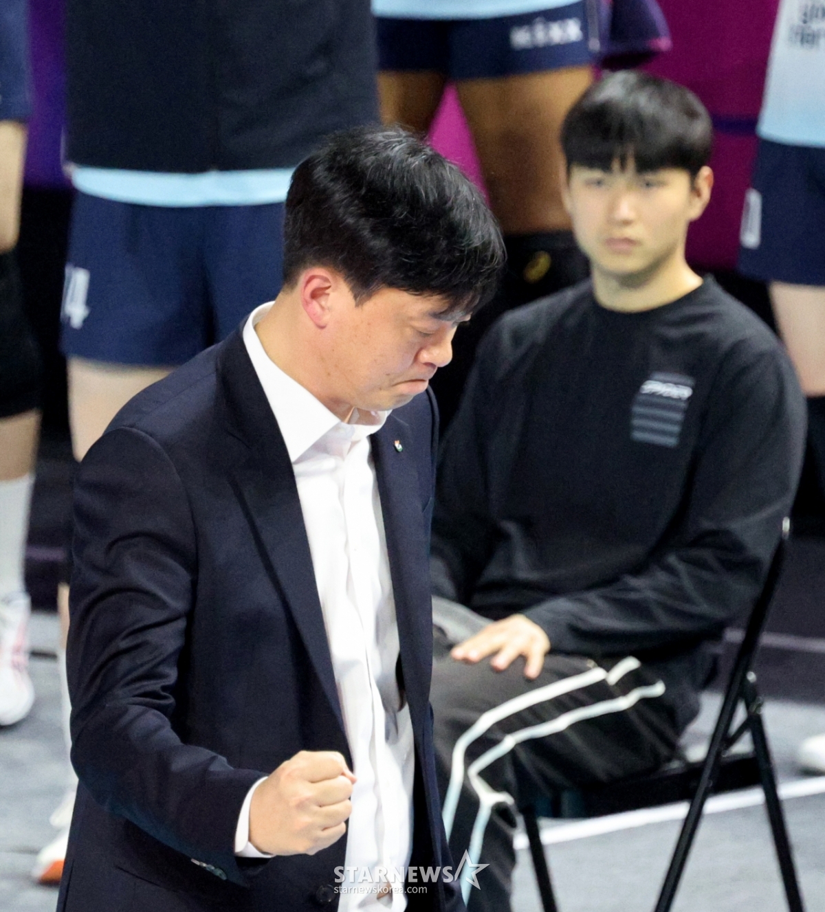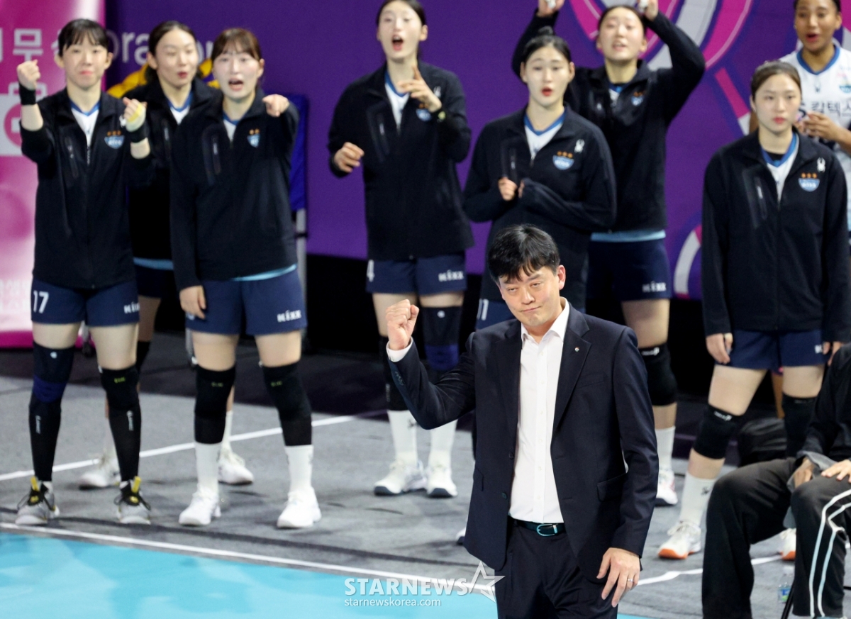 GS 이영택 감독이 27일 삼산월드체육관에서 열린 여자부 흥국생명과 GS칼텍스 경기에서 선수들과 함께 박수와 엄지척을 보내며 경기를 자축했다.