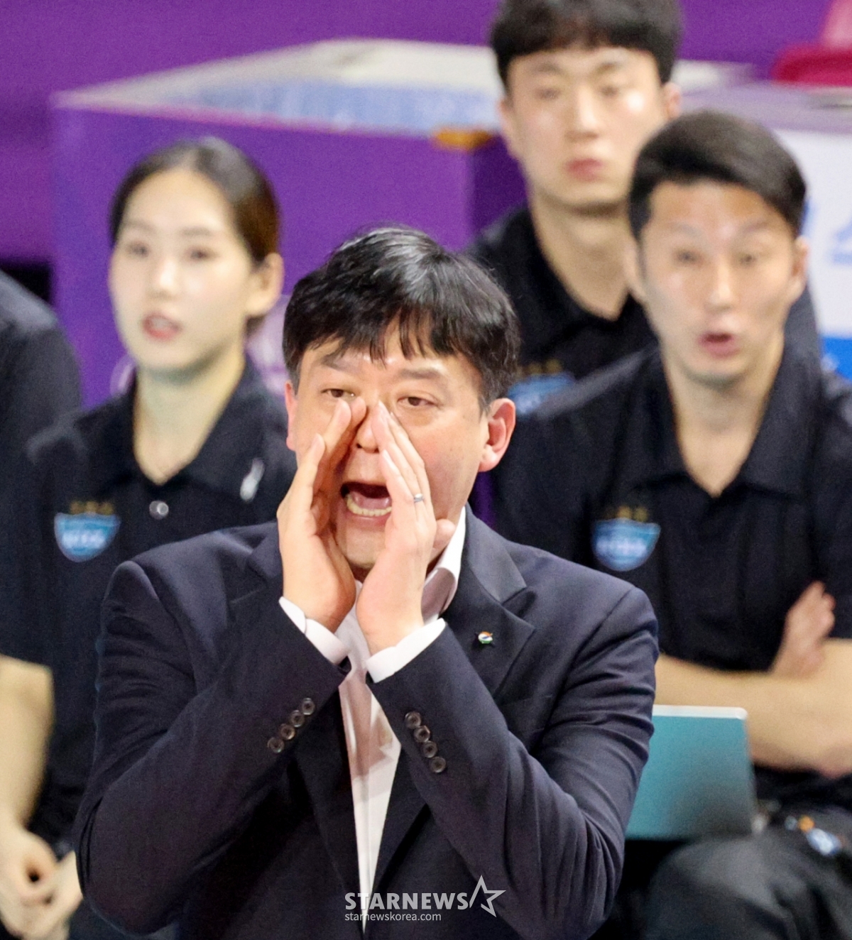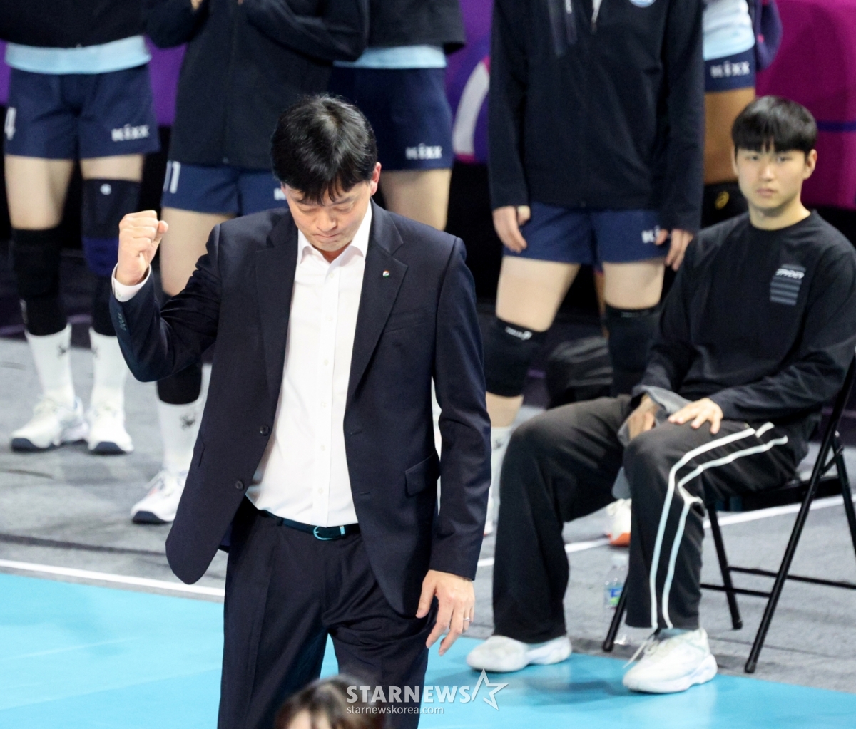 GS 이영택 감독이 27일 삼산월드체육관에서 열린 진에어 2025-2026V리그 여자부 흥국생명과 GS칼텍스 경기에서 선수들에 박수와 썽엄지척을 보내며 자축하고 있다.2026.02.27.