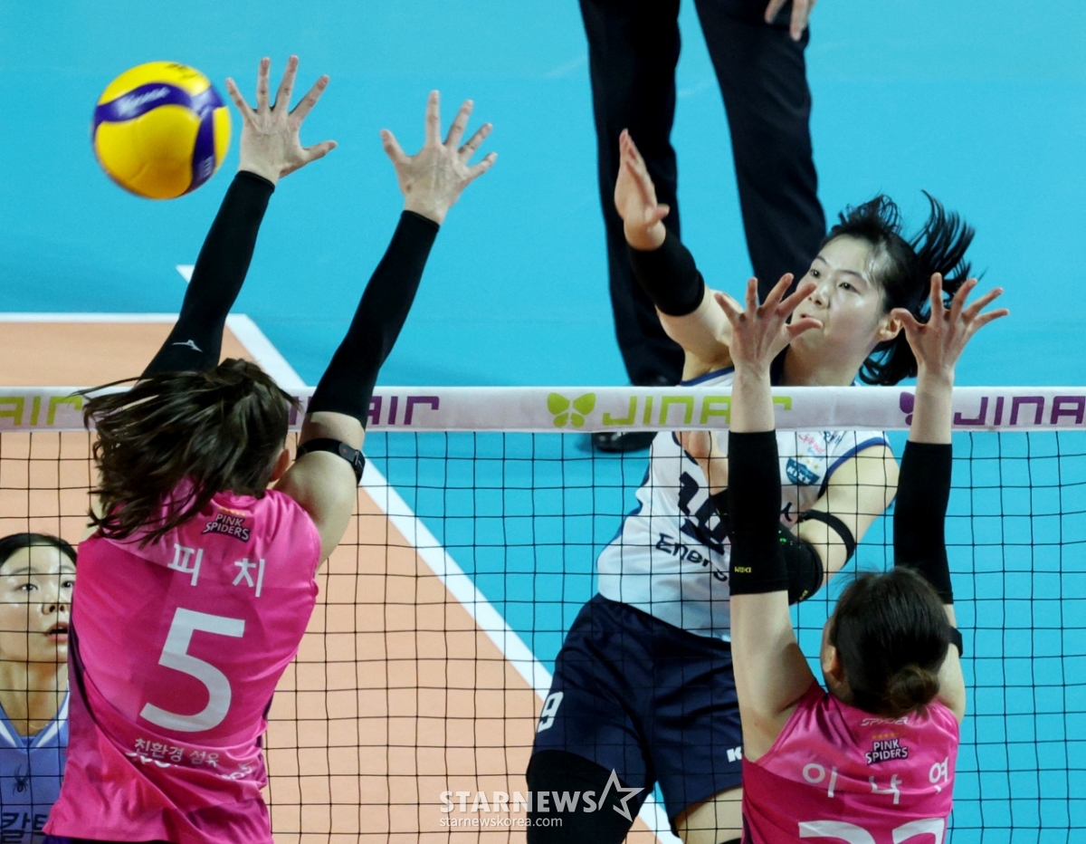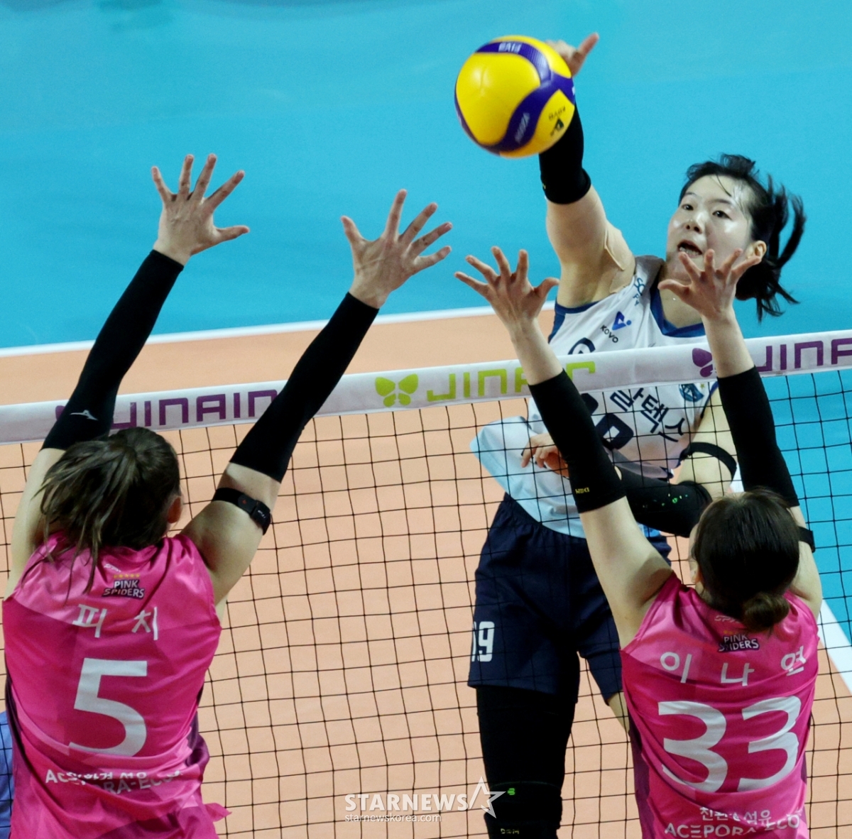 GS 유서연이 27일 삼산월드체육관에서 열린 진에어 2025-2026V리그 여자부 흥국생명과 GS칼텍스 경기에서 흥국 이중블로킹에 강타를 터트리고 있다.2026.02.27.