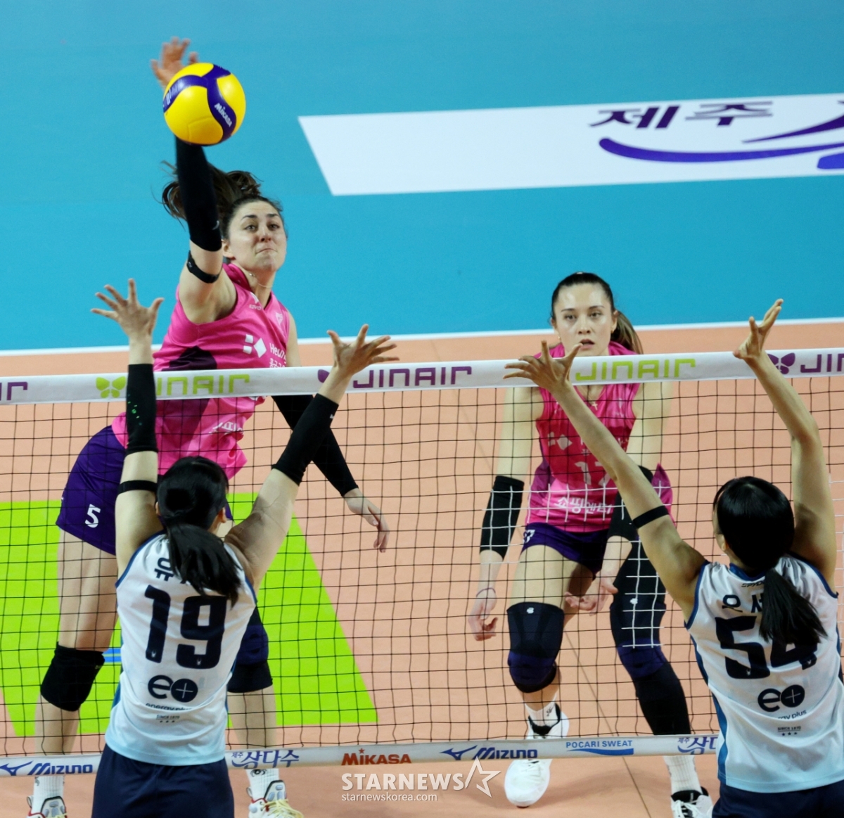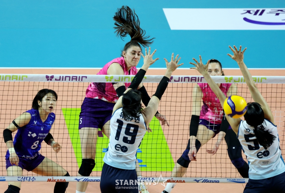 흥국 피치가 27일 삼산월드체육관에서 열린 진에어 2025-2026V리그 여자부 흥국생명과 GS칼텍스 경기에서 GS블로킹에 이동공격을 시도하고 있다.2026.02.27.