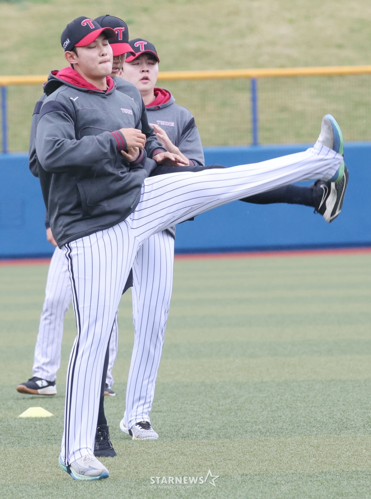 LG 트윈스가 27일 일본 오키나와현 카데나 야구장에서 스프링캠프 일정을 진행했다. 김영우를 비롯한 투수조가 스트레칭 훈련을 하고 있었다.