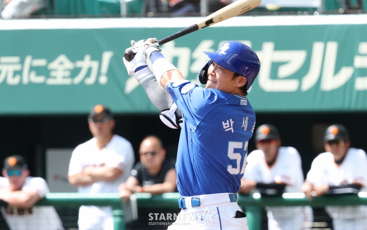 삼성 박세혁이 호쾌한 타격을 하고 있다.