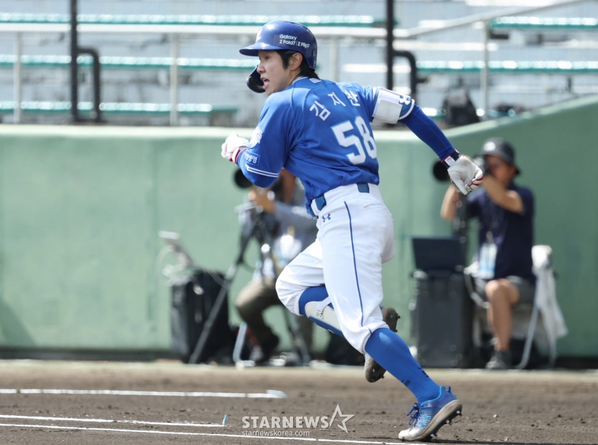 삼성 김지찬이 호쾌한 타격을 하고 질주하고 있다.